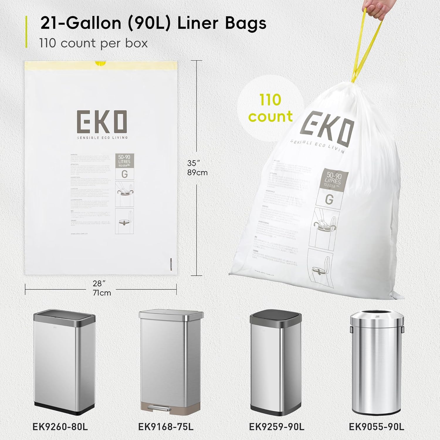 EKO 21 Gallon / 50-90 Liter,110 CountDrawstring Trash Bags, Extra-Strong Unscented Garbage Bags, Easy-Dispense Roll for Kitchen & Household Use, Resists Tears, Leaks and Punctures, Code G, White