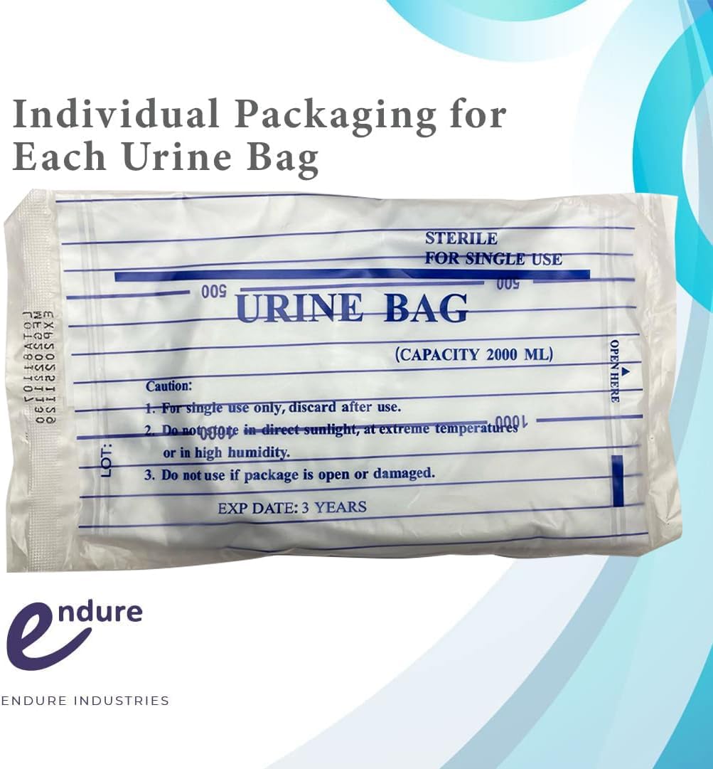 Endure Adult Sterile Urine Bag, 2000 ml, Unisex Emergency Medical Drainage Bag with Anti-Reflux Valve, Pack of 5