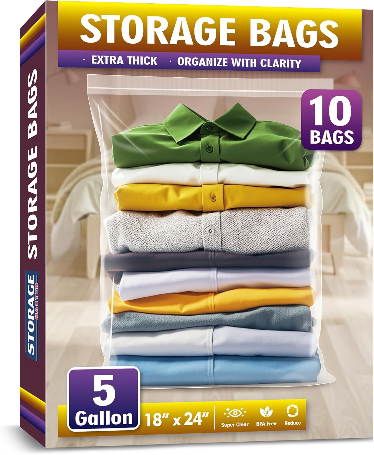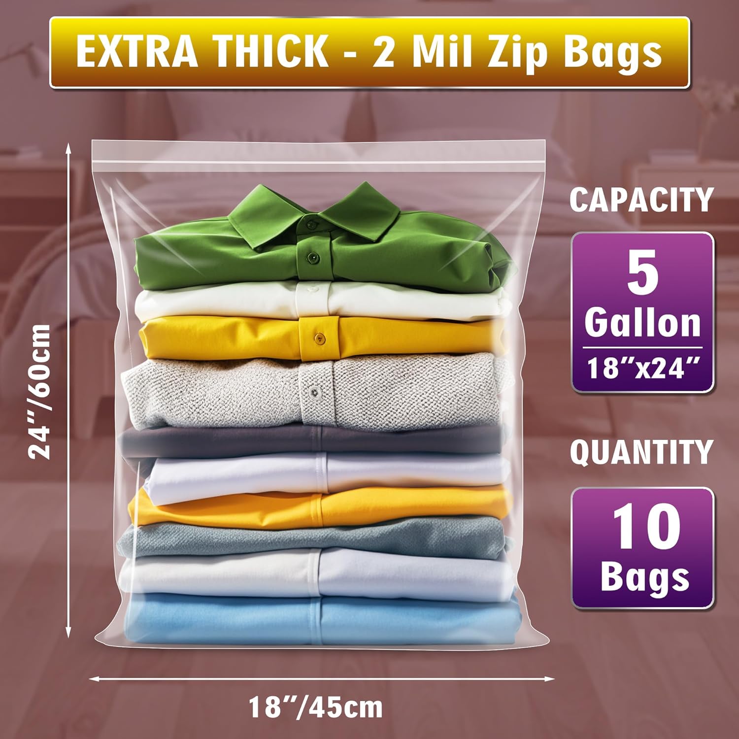 Extra Large 5 Gallon Zippered Plastic Bags for Storage- 18” x 24”, Ideal for Clothes Clothing, Travel, Moving, 2-mil Thick Clear Plastic, 10 pack