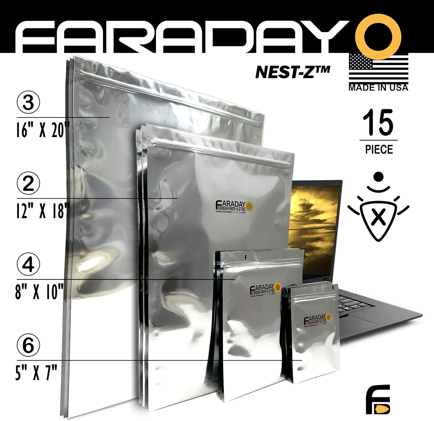 Faraday Defense 15pc Kit NEST-Z Faraday Bag for EMP/Solar-Flare Ultra Thick – Military Grade Design, Superior Shielding Performance, Phones – Radios – Hard Drives – Tablets – Laptops MADE in USA