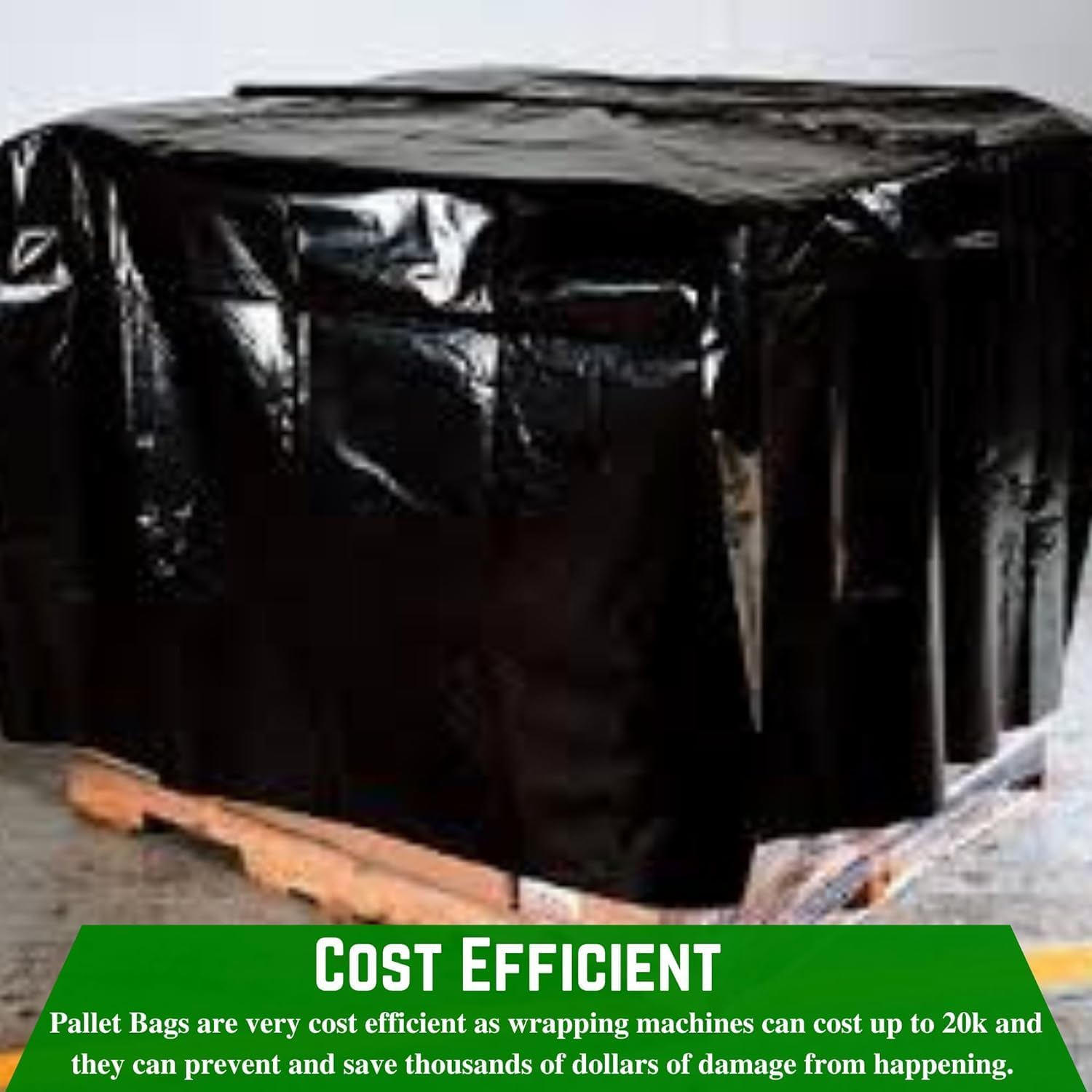 Cost Efficient: Pallet Bags are a very efficient solution because wrapping machines cost up to 20k and pallet bags can save thousands of dollars in damage. These plastic fitted tarp covers even save the time needed for wrapping a pallet. Our product easily slides over your pallet or object that needs protection. They have pleated sides that expand to the width of a standard pallet.