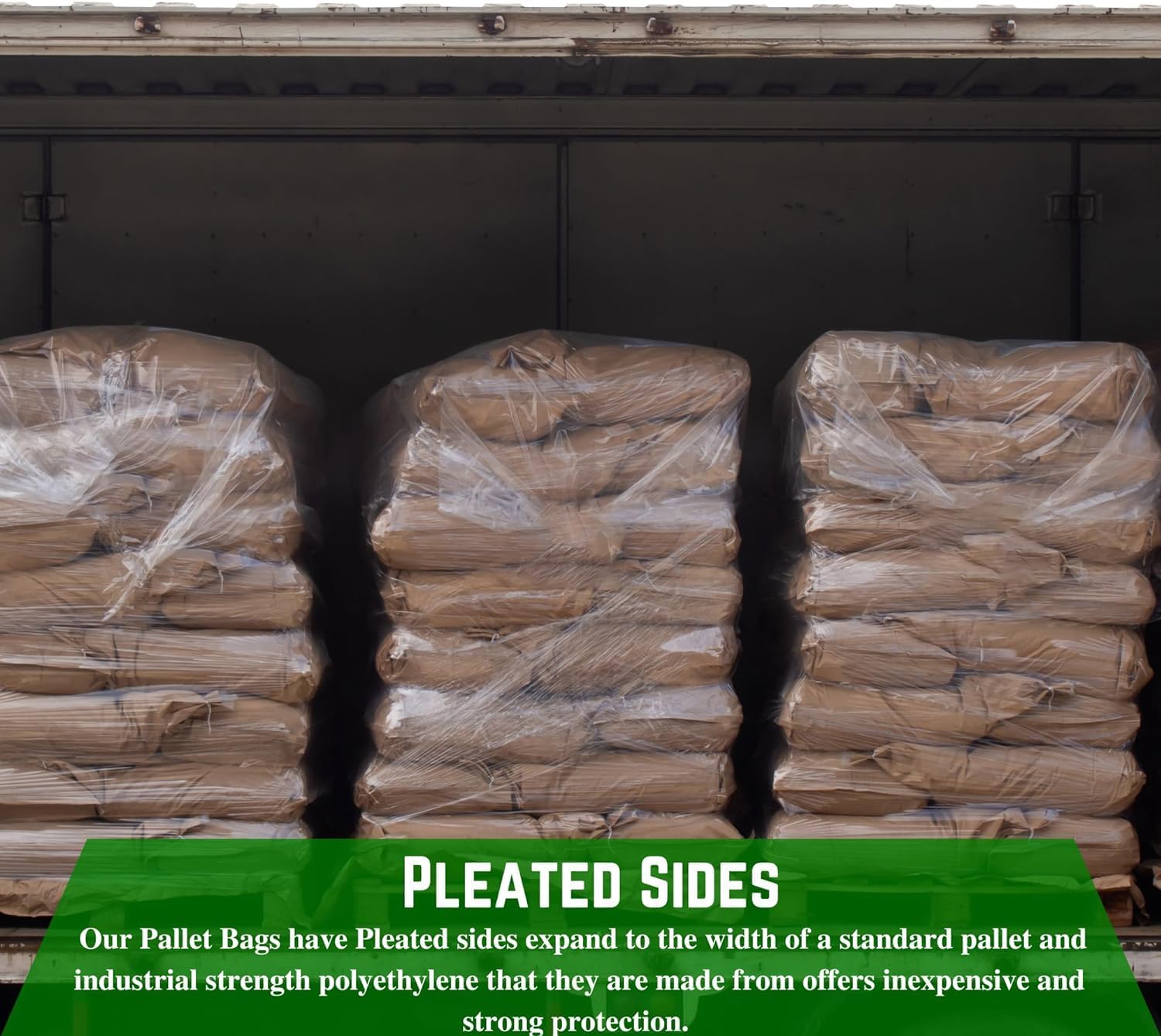 Pleated Sides: Our Pallet Bags Pleated sides expand to the width of a standard pallet and industrial strength polyethylene that they are made from offers inexpensive and strong protection.