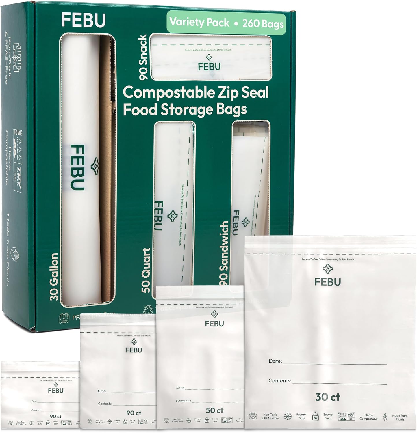 FEBU Compostable Food Storage Bags Variety Pack, 260 Count | Compostable & Biodegradable | PFAS & BPA Free, Non-Plastic | Drawer Organizer Box | 90 Snack, 90 Sandwich, 50 Quart, 30 Gallon