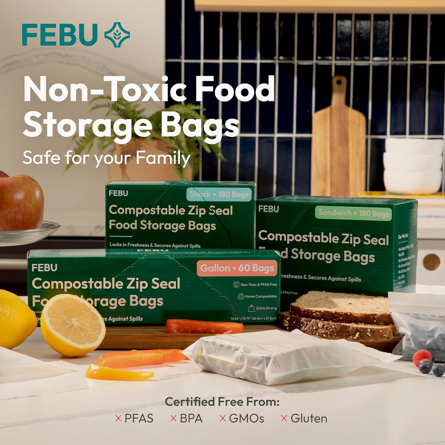 PROTECT YOUR FAMILY WITH NON-TOXIC FOOD STORAGE — Keep food fresh and your family safe with our bags made from plant-based and compostable materials. FEBU non plastic food storage bags are certified free from PFAS, BPA, GMOs, gluten, and other harmful chemicals, ensuring nothing leaches into your food.