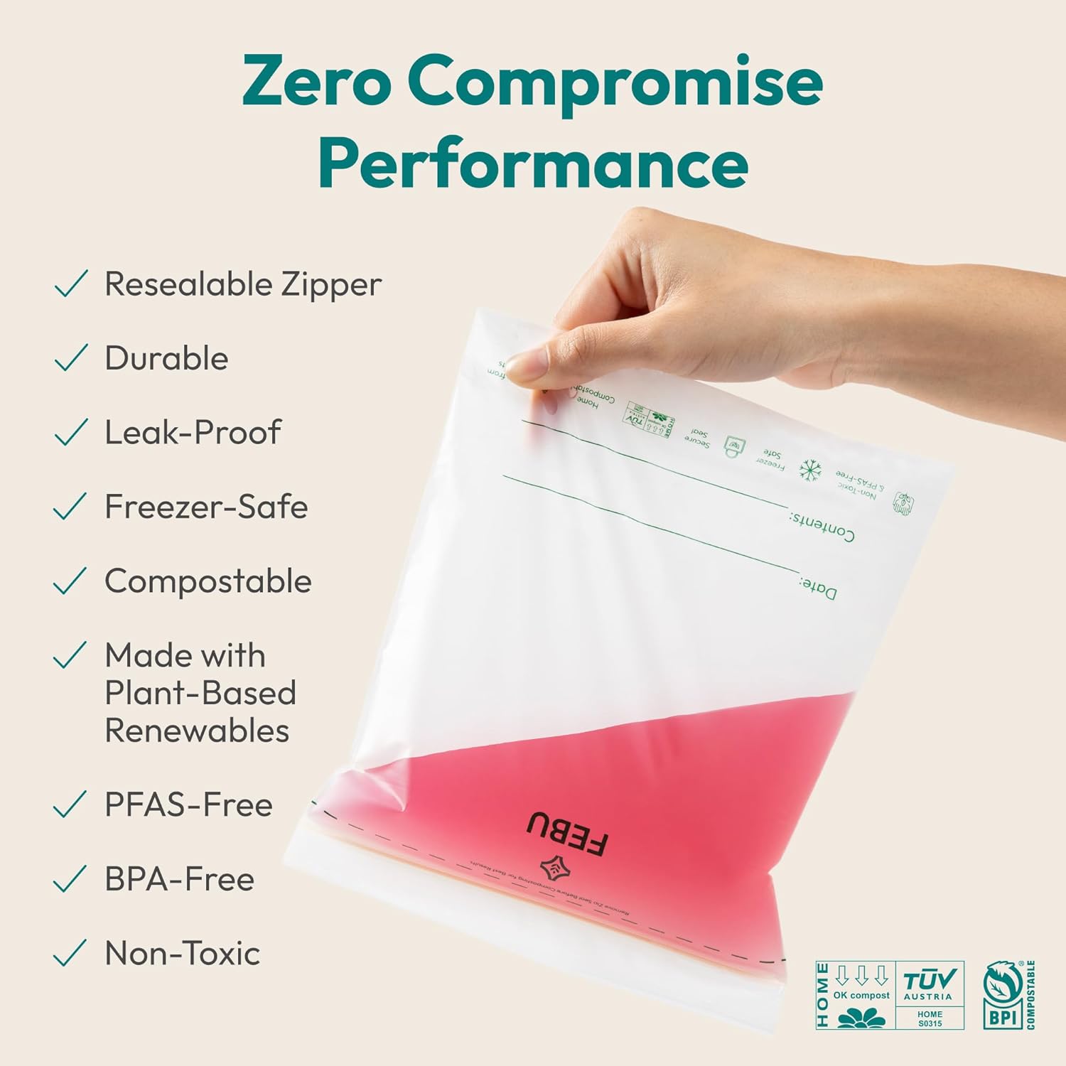 CERTIFIED FOR YOUR HOME COMPOST — Normal plastic food storage bags aren’t recyclable in curbside recycling facilities, meaning they end up in a landfill. FEBU compostable zipper bags are dual-certified for industrial and home composting by BPI and TUV Austria (OK Home Compost), and are designed to break down cleanly into nutrient-rich soil within weeks in ideal conditions, without producing harmful microplastics.