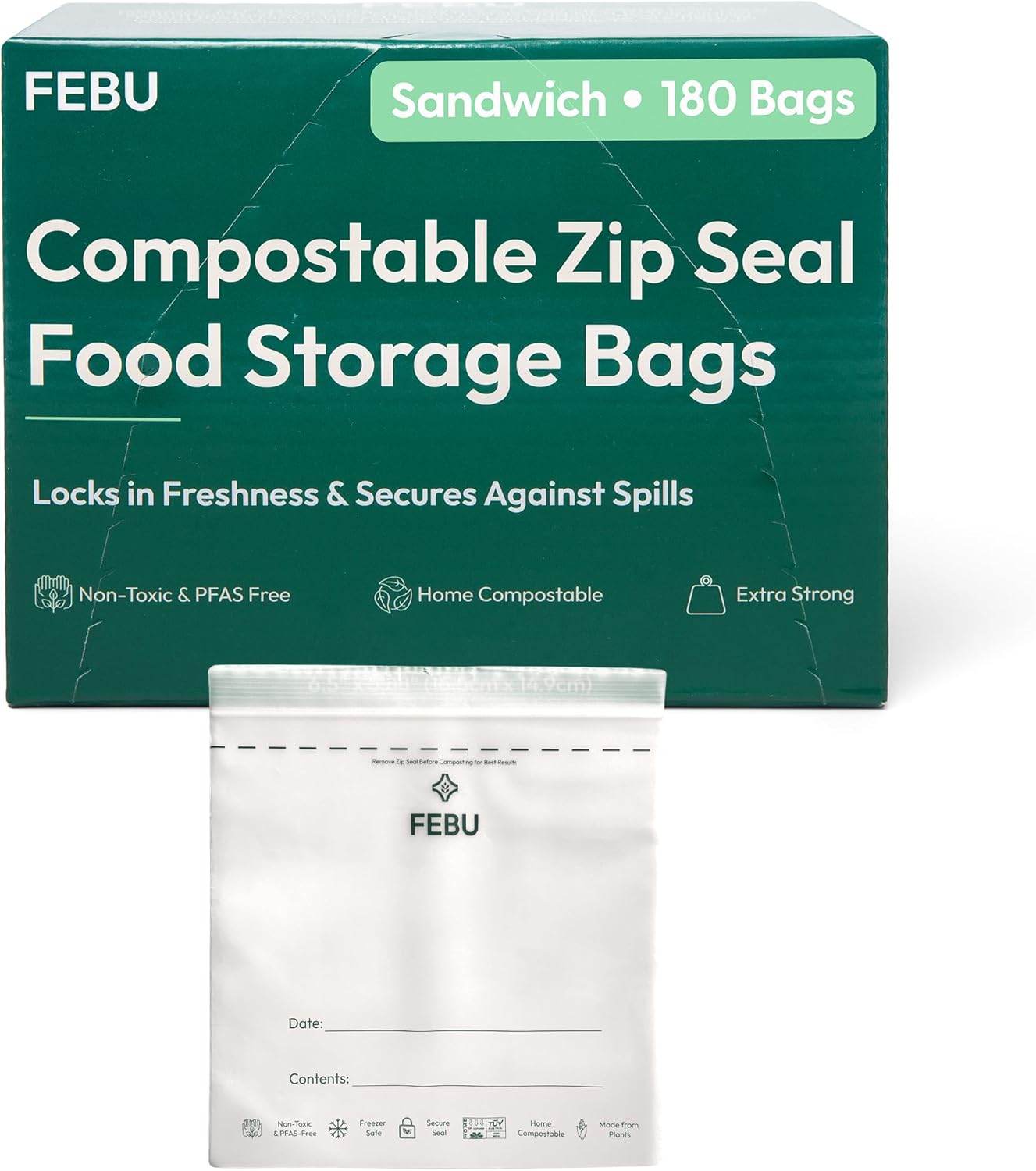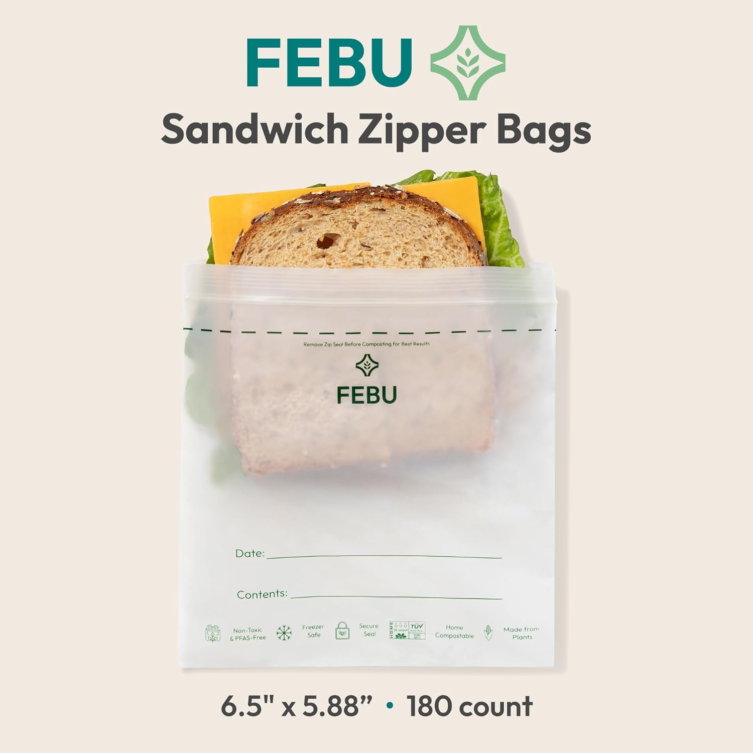 FEBU Sandwich Compostable Food Storage Bags, 180 Count | Certified Home Compostable & Biodegradable | PFAS & BPA Free, Non-Plastic Zipper Bags | Leak-Proof & Resealable | 6.5″x 5.88”