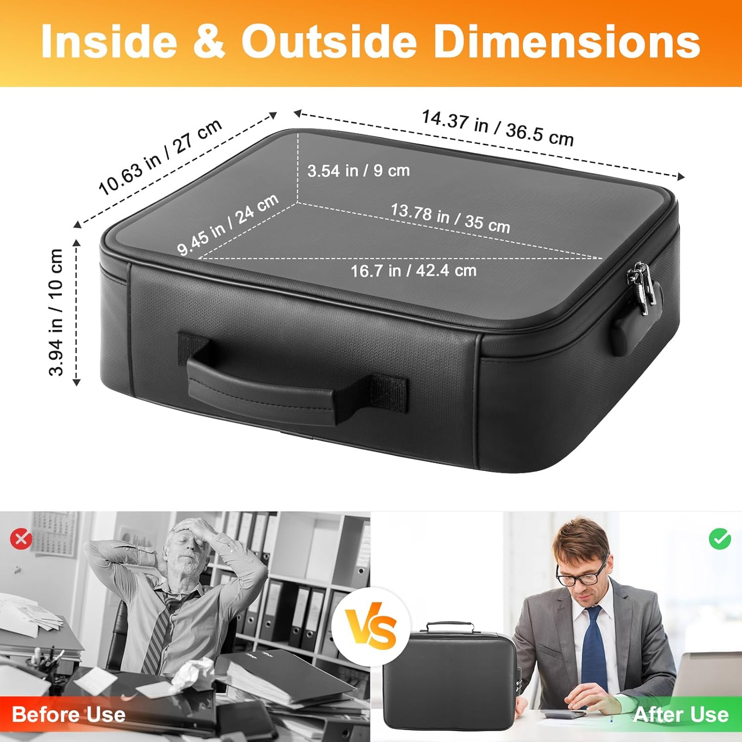 【Spacious and Practical】The fireproof bag measures 14.4 x 10.6 x 4.0 inches and weighs 1.26 pounds. The bag boasts a generous interior, providing ample space to store a variety of items, including documents, laptops, cash, cards, jewelry, and electronic devices. Its smart design includes multiple compartments and pockets, allowing you to organize your belongings efficiently and retrieve them quickly when needed. Perfect for home, office, or travel use.