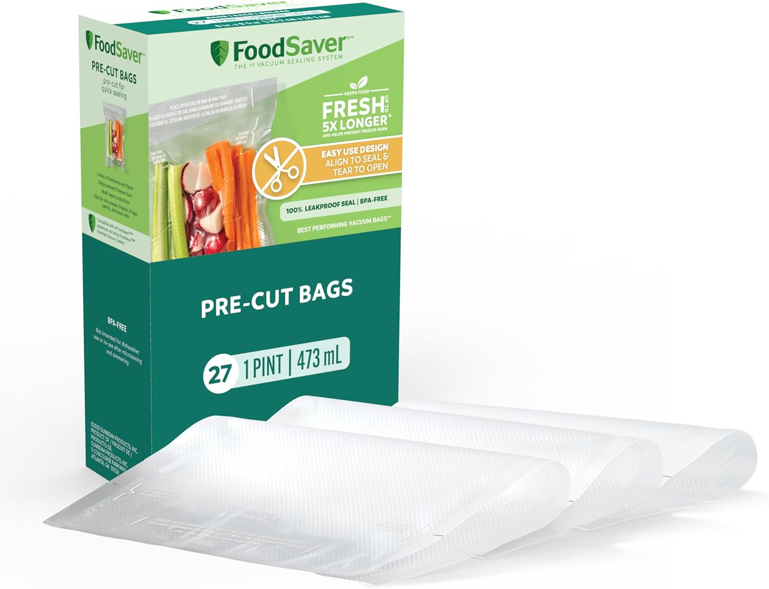FoodSaver Pint Pre-Cut Vacuum Seal Bags, Easy Use Vacuum Storage Bags, Align to Seal and Tear to Open Vacuum Sealer Storage Bags, 27 Pack
