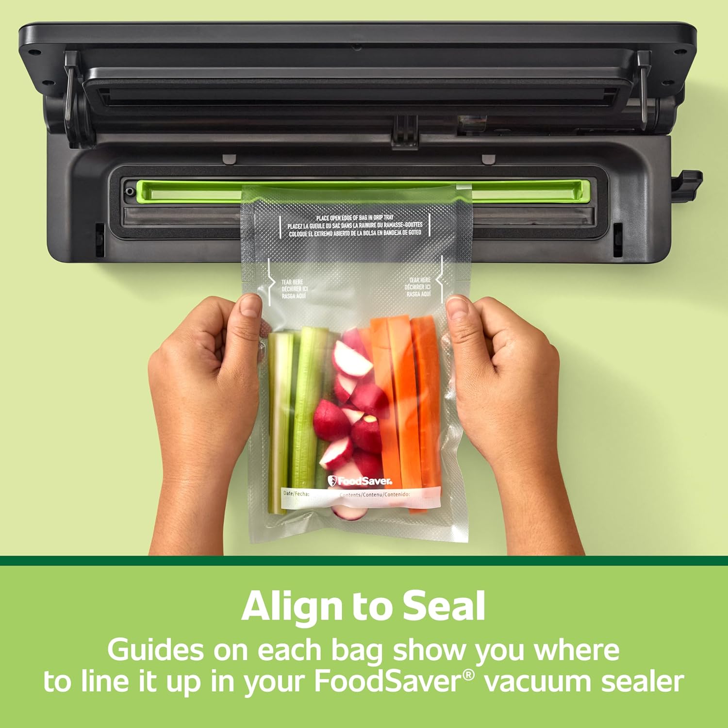 Make meal prep quicker and easier than ever before with FoodSaver pre-cut bags featuring Easy Use design. The alignment guide shows you exactly where to place the bag in the machine, ensuring a perfect, 100% leakproof seal for your vacuum storage bags every time. And there’s no need for knives or scissors: Tear-to-open notches are on the side of each bag, giving you easy access to your prime cuts of meat, fresh veggies, and more vacuum-sealed foods you’ve chosen to preserve. Multi-layer protection helps prevent freezer burn, too, as the pre-cut bags keep food fresh up to 5x longer (compared to ordinary storage methods). Whether you’re looking to meal prep or seal up leftovers for later, the bags are safe for microwaving and sous vide cooking when you’re ready to cook. These vacuum sealer bags for food are compatible with all FoodSaver appliances, excluding handheld vacuum sealer models. FoodSaver pre-cut bags make it easier than ever to keep the foods you love fresher longer: Simply align to seal and tear to open.