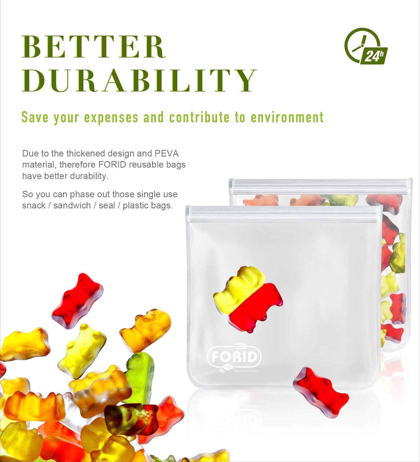 Food Grad Material & Eco-Friendly – FORID 1 gallon storage bags feature upgrade FDA food-grade PEVA material, which is eco-friendly, silicone & plastic-free, PVC-free, chloride-free, BPA-FREE, harmless to the environment when disposed of or burned. Choose these healthy and safe reusable gallon bags for your family and the earth!