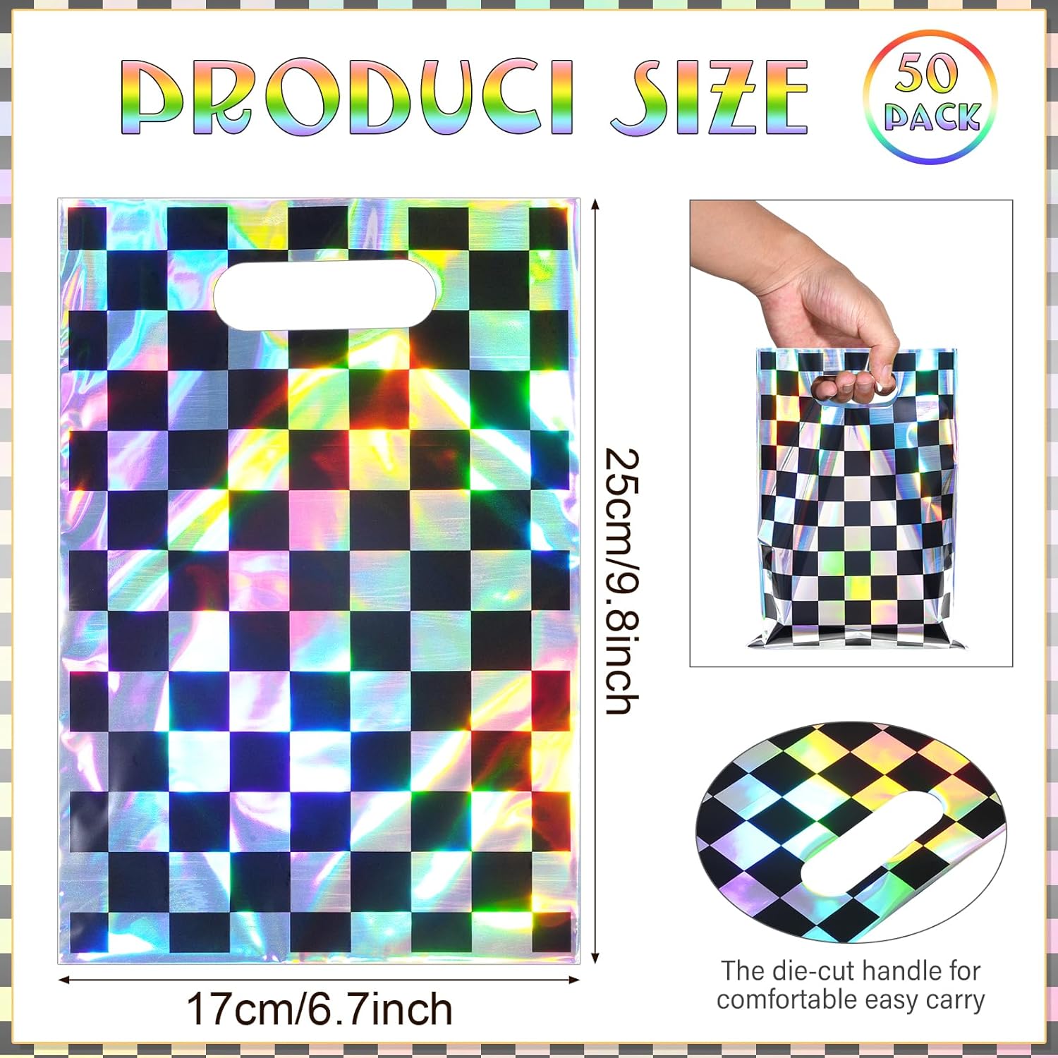 FunnyPars 50 Pcs Iridescent Checkered Race Car Party Favor Bags, Plastic Black and Iridescent Car Goodie Treat Bags, Racecar Laser Plaid Gift Bags for Kids Fast Race Car Birthday Party Decorations
