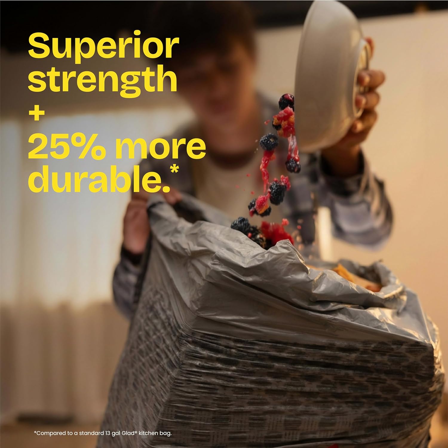 LEAKGUARD TRASH BAG: Tackle kitchen chores with confidence thanks to the first kitchen trash bag with liquid locking technology that absorbs liquids for up to 100% leak protection; pack may vary