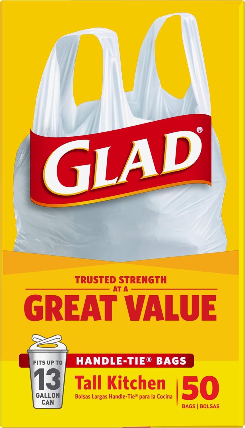 Glad Tall Kitchen Handle-Tie Trash Bags are designed with built in handles to help make trash collection more convenient. The strong and dependable handles allow you to lift and carry the fullest bag with ease avoiding messy trash disasters. Simply cross tie the handles together to securely close, grab the bag by the handle and remove from container. The 13 gallon size is perfect for the kitchen or throughout the house and is great for your seasonal cleaning needs like Spring Cleaning and Back to School. Glad trusted strength at a great value.