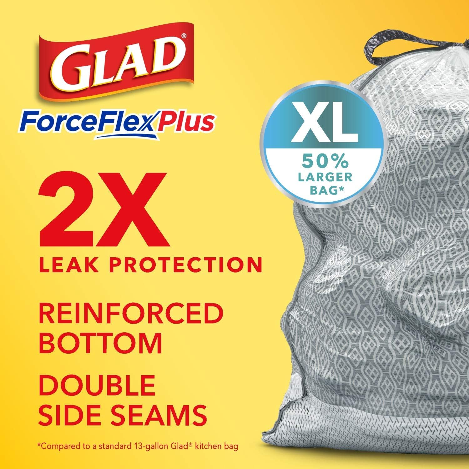 FORCEFLEXPLUS TECHNOLOGY: Glad’s patented dual-layer technology provides two layers of strength and stretch for 2X Leak Protection with double side seams and a reinforced bottom