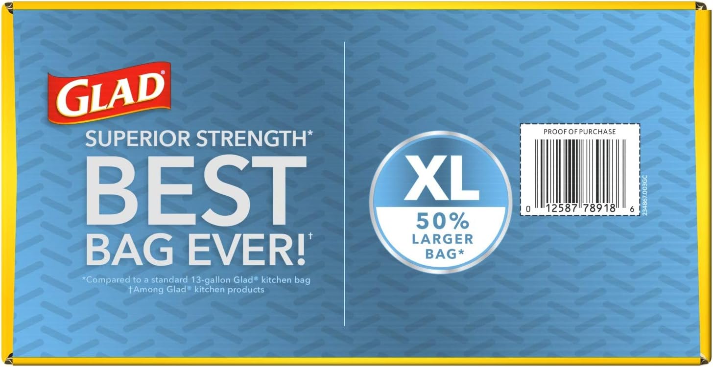 Glad ForceFlexPlus XL X-Large Kitchen Drawstring Trash Bags are 50% larger compared to Glad 13 Gallon Trash Bags to handle the toughest kitchen and household garbage loads. Designed with ForceFlexPlus technology, these trash bags provide two layers of strength and stretch for 2X Leak Protection. Plus, they trap, lock and neutralize odors with lasting Febreze freshness in Fresh Clean scent. What goes in the trash, stays in the trash with Glad, featuring RipGuard and LeakGuard technology. Glad’s two durable layers handle the most demanding trash, with an outer layer to protect against leaks and a strong inner layer to prevent rips and tears. The Grips-The-Can Drawstring ensures that the bag stays in place, making it easy to close and carry out the trash.