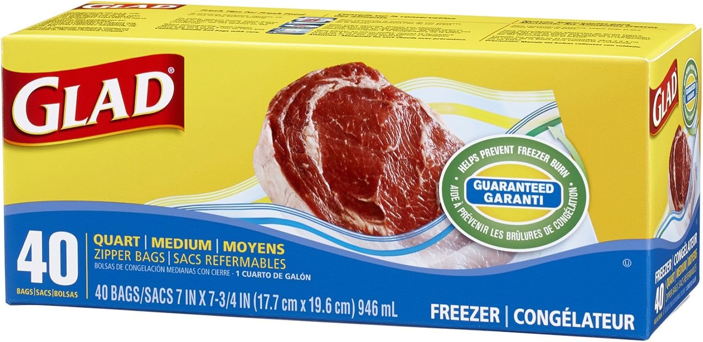 ZIPPER QUART FREEZER BAGS: Glad zipper freezer bags are BPA free, have a zipper closure and are an essential storage solution for a busy kitchen; Packaging may vary