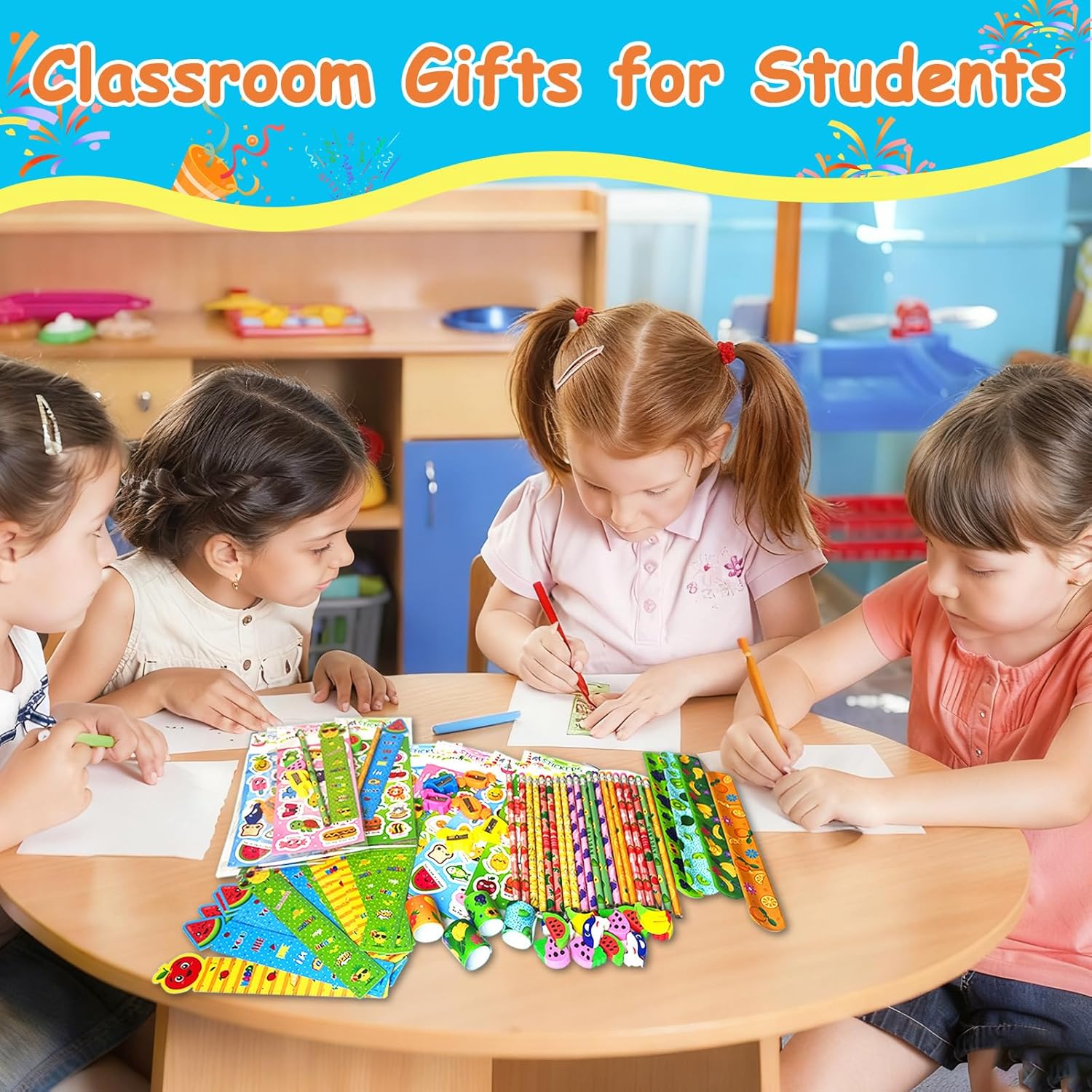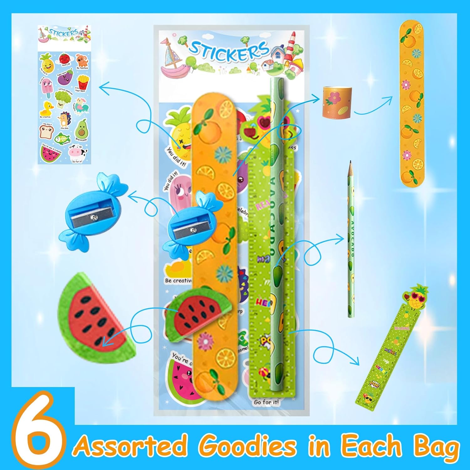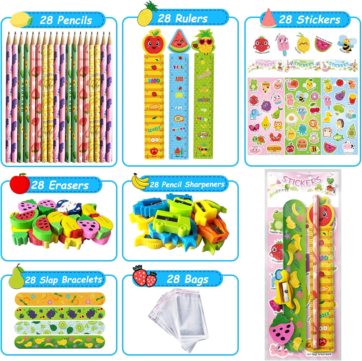 Complete Stationery Party Pack – Each set includes 28 sheet stickers, 28 cute rulers, 28 pencils, 28 erasers, 28 pencil sharpeners, 28 clear bags and 28 colorful slap bracelets—everything you need for creative birthday goodie bags and classroom gifts.