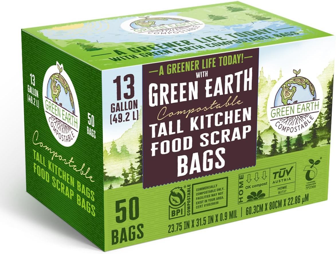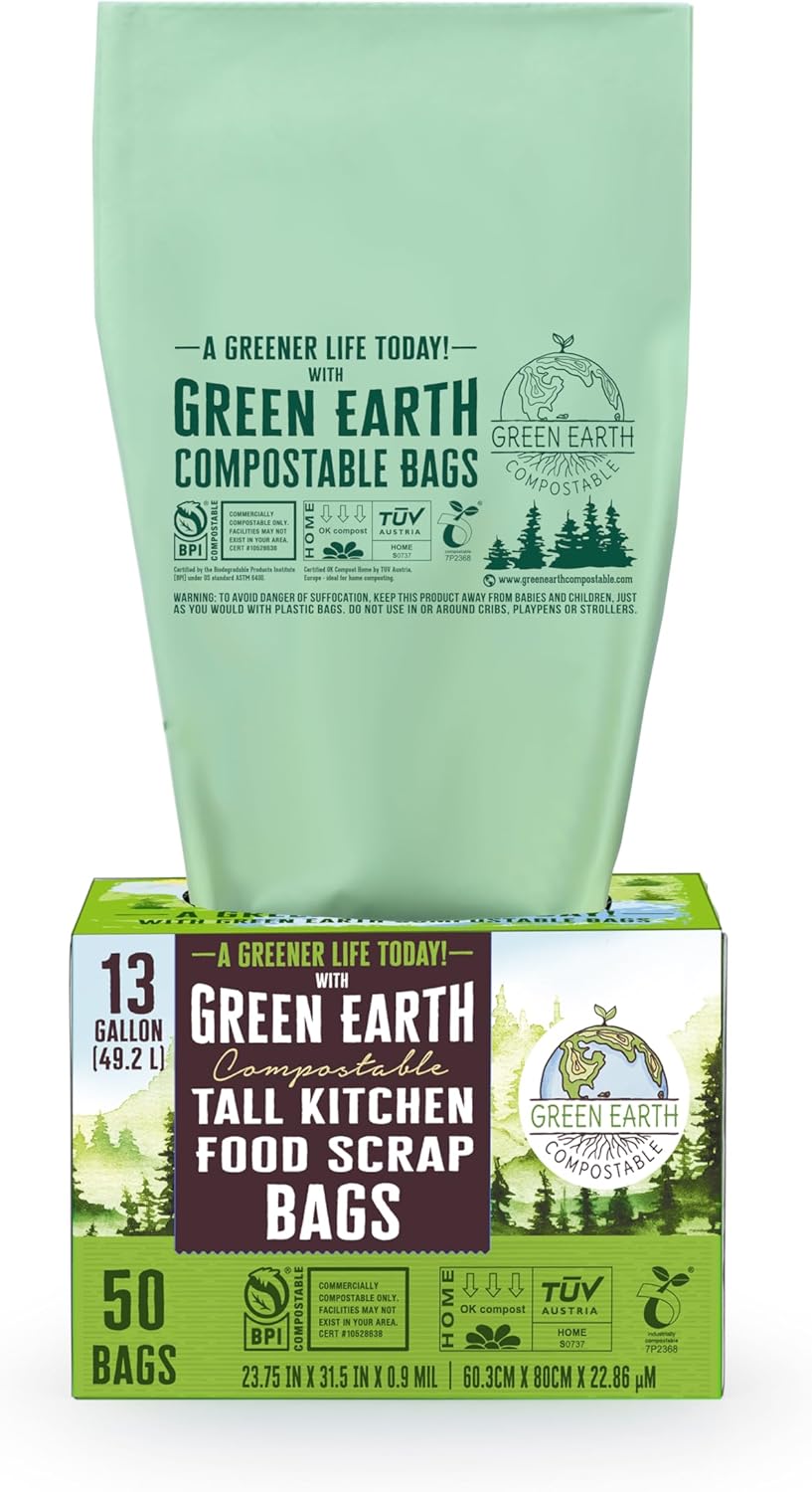 Green Earth Compostable Tall Kitchen Food Scrap Trash Bags, Superior Strength 0.9 Mil, Compost Bin Compatible, 13 Gallon, 49 Liter, 50-Count, ASTM D6400, BPI (US) & OK Compost Home (EU) Certified