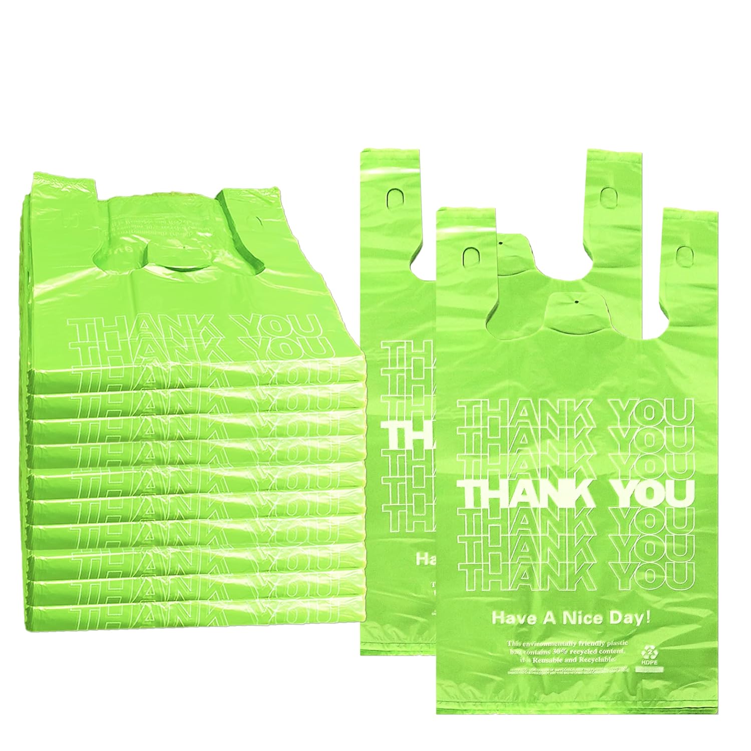 Sturdy & Durable – Made of high-quality HDPE material, these green “Thank You” T-shirt bags are strong, tear-resistant, and reliable for daily use in small businesses or take-out services.