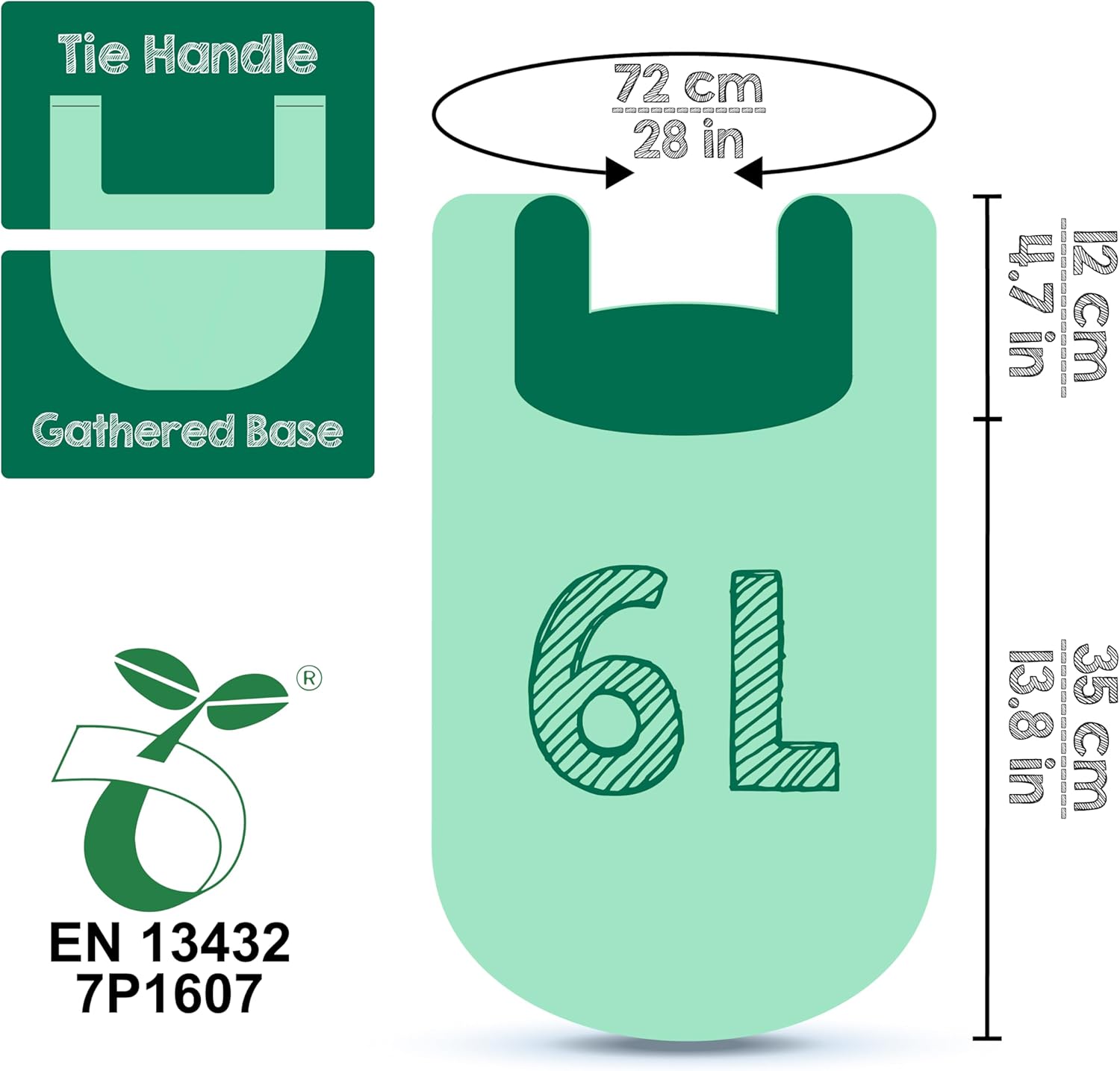 GREENER WALKER 100% Compostable Trash Bags with Tie Handles, 1.6 Gallon-150Bags, Food Scrap Kitchen Waste Bags with EN13432 Certified