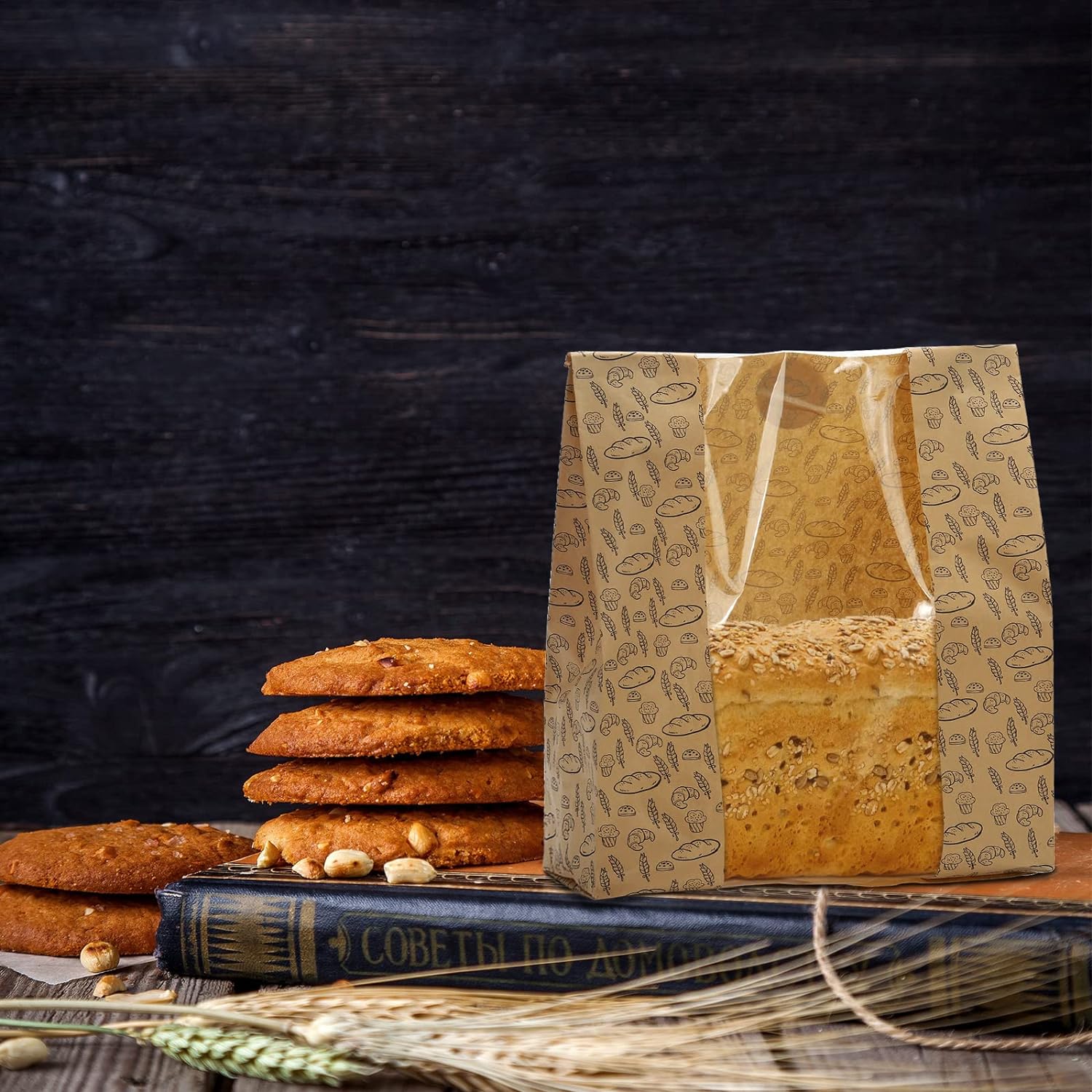 Hacaroa 100 Pack Paper Bread Bags with Clear Window, 10.8″x10″x4″ Kraft Bakery Bag with 100 Stickers, Brown Toast Packaging Bags for Sourdough Bread, Cookie