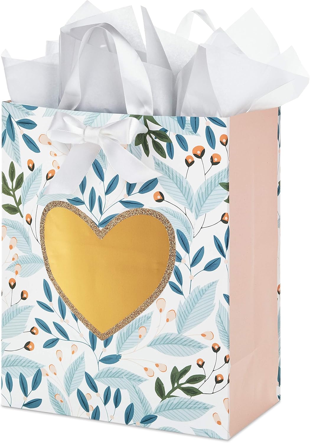 Hallmark 13″ Large Gift Bag with Tissue Paper (Green Foliage, Gold Heart) for Weddings, Engagements, Anniversaries, Bridal Showers, and More