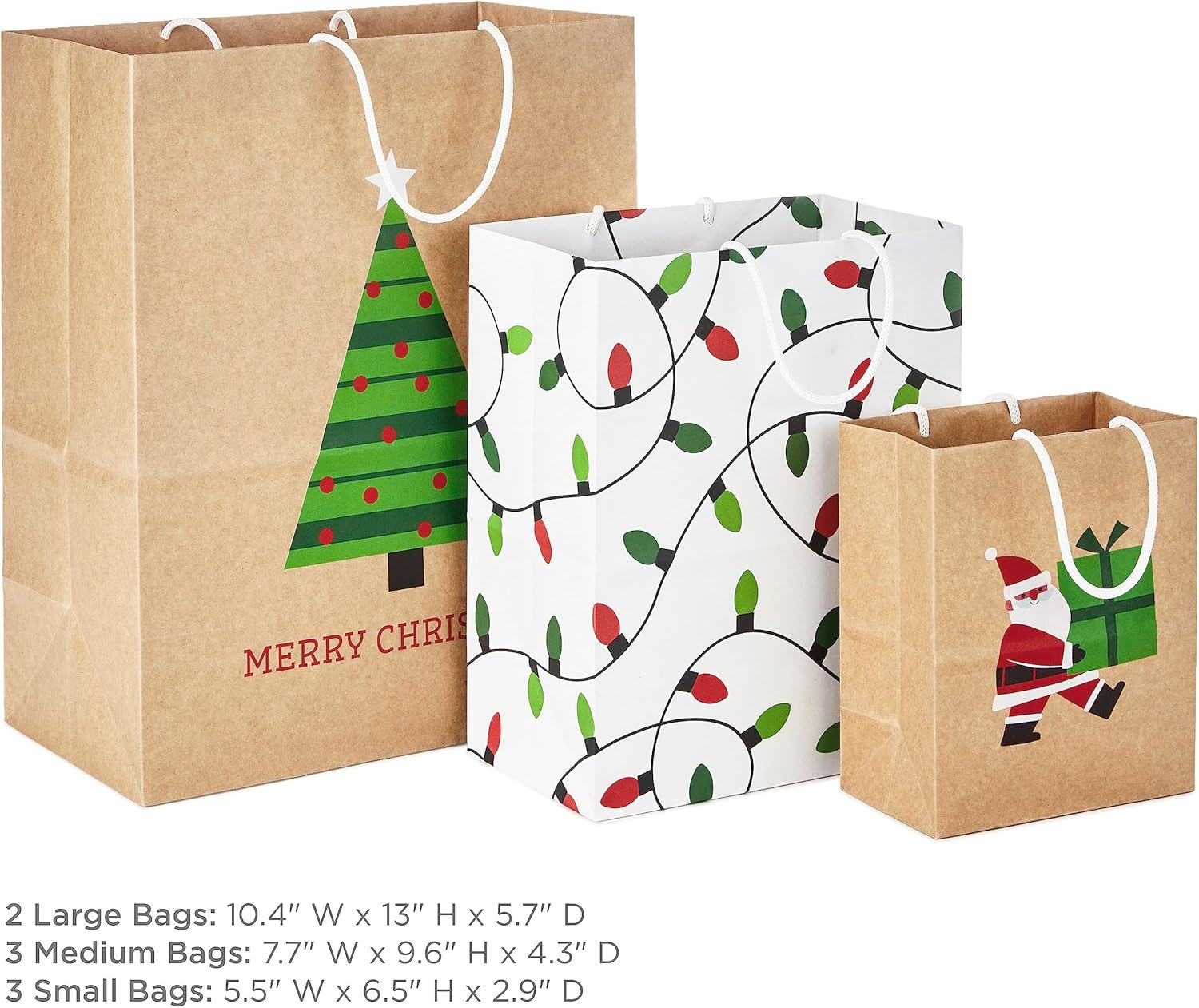 Hallmark Christmas Gift Bags for Kids (8 Bags: 3 Small 6″, 3 Medium 9″, 2 Large 13″) Recyclable Kraft with Santa, Lights and Tree