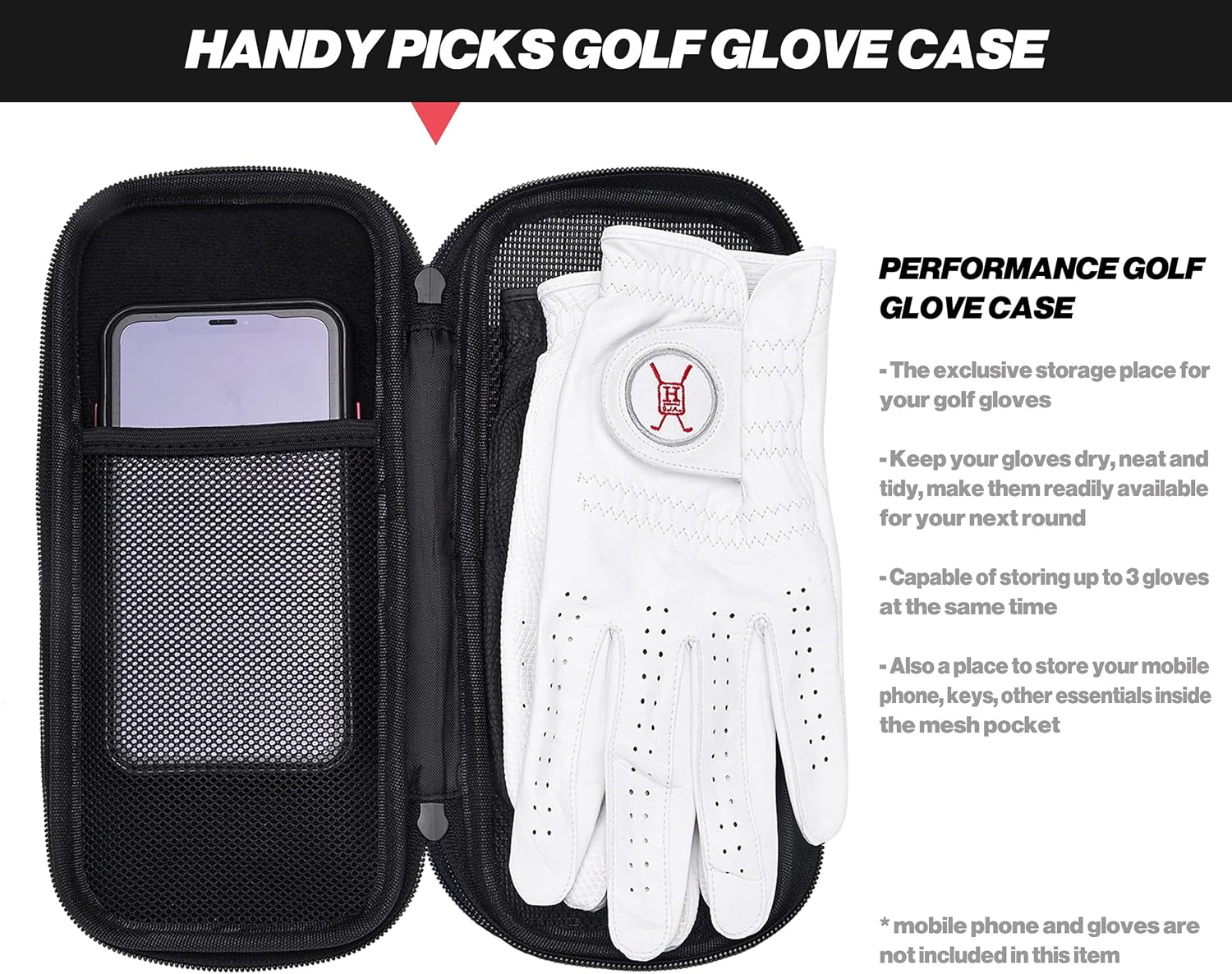 Performance Golf Glove Case: Handy Picks golf glove case is carefully constructed with a heavy duty hard cover to protect your gloves and a high quality mesh back cover that enables air flow between inside and outside of the case. This feature prevents your gloves stored inside the case from retaining moisture and crumpling up.