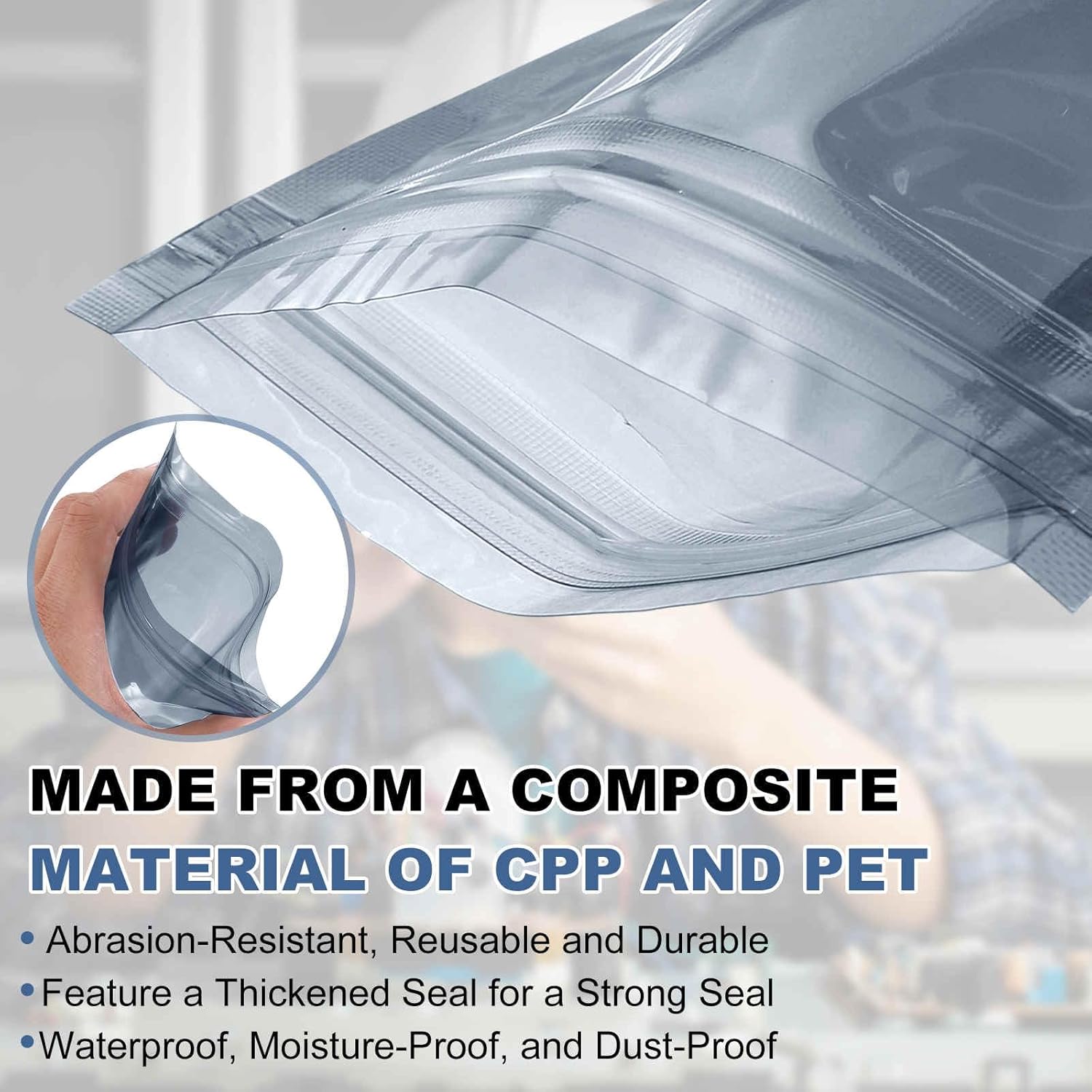 Material – Made from a composite material of CPP and PET, these anti-static bags are abrasion-resistant, feature a thickened seal for a strong seal, are waterproof, moisture-proof, and dust-proof, and are reusable and durable. The translucent design is stylish and easy to identify, making them safe, practical, and aesthetically pleasing.