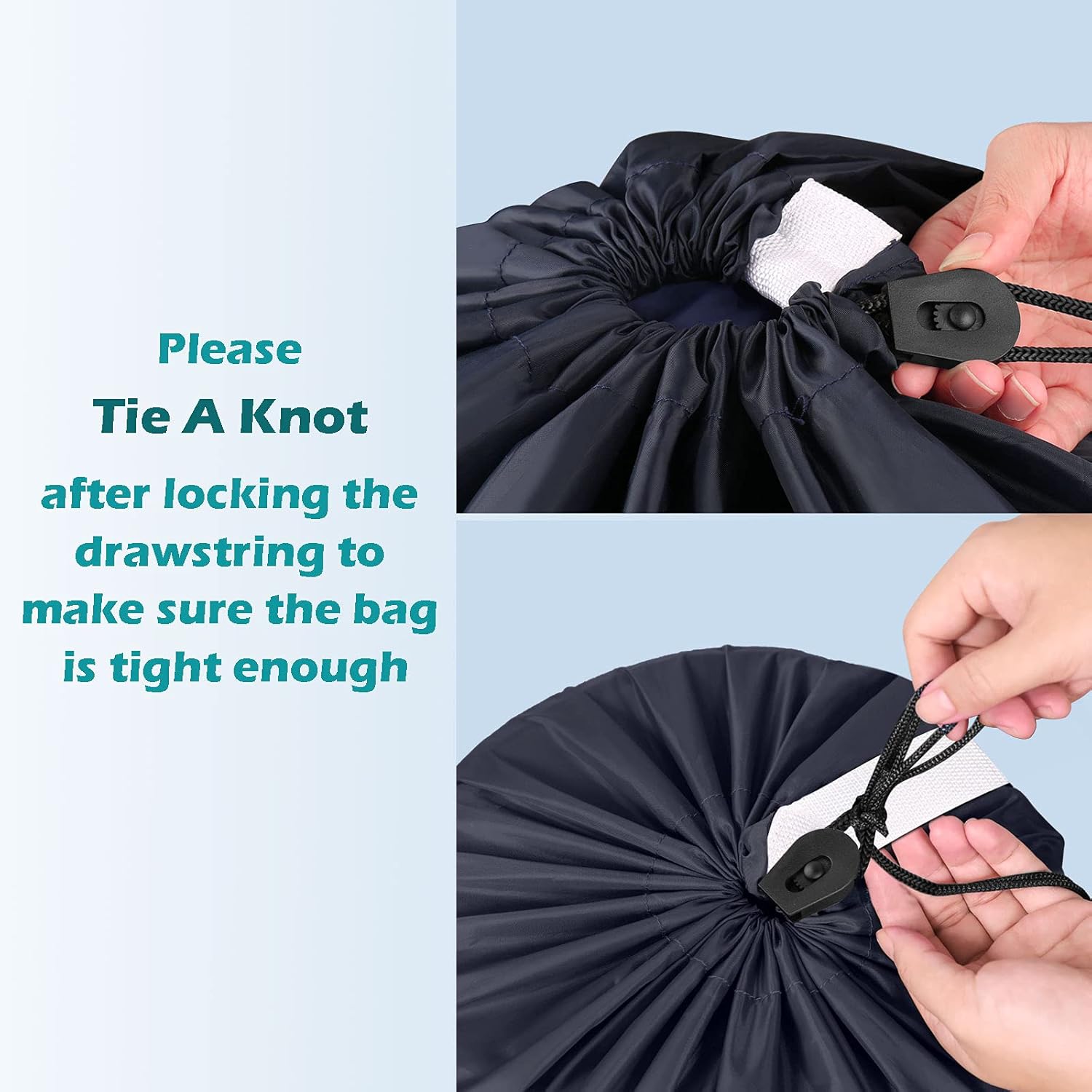 Please Tie A Knot after locking the drawstring to make sure the bag is tight enough.Wash in cold water and air dry for long-term use. (Machine washable)