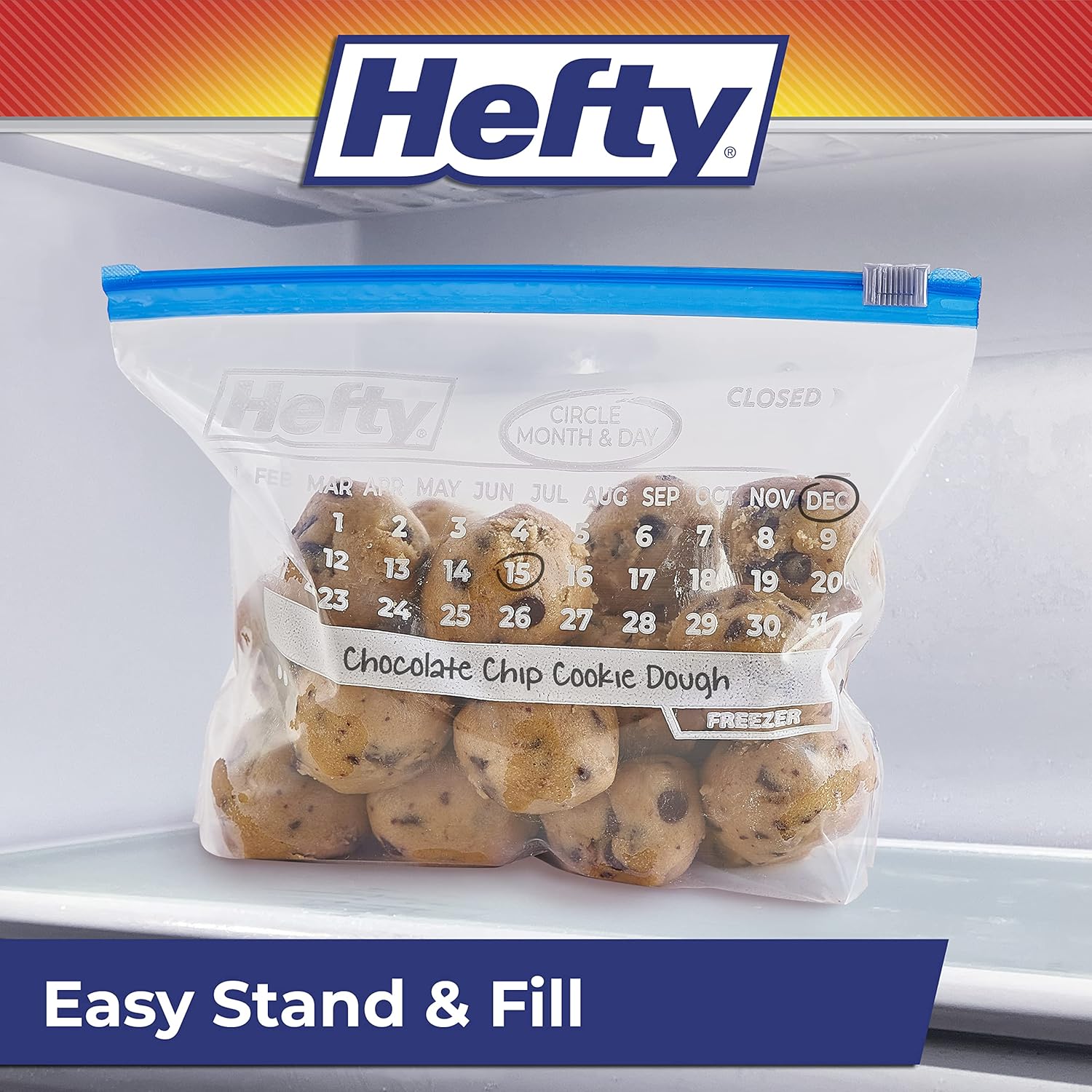 Hefty Calendar Slider Freezer Bags provide a simple solution for solving the mystery of what’s in the freezer and how long it’s been there. Simply use the large write-on labels on these quart freezer bags to label the contents, circle the month and date on the printed-on calendar, and store away! No more guesswork when you’re looking for something in the freezer. The easy-to-use, patented MaxLock(R) track design on these quart zip bags creates an extra strong seal and the Clicks Closed(TM) feature lets you know when these BPA-free plastic bags for food storage are securely closed. Plus, the stand-and-fill expandable bottom makes it easy to meal prep, load leftovers, fruit, and more into these Hefty slider bags with ease. Hefty’s premium quality comes with a 100% Satisfaction Guarantee.