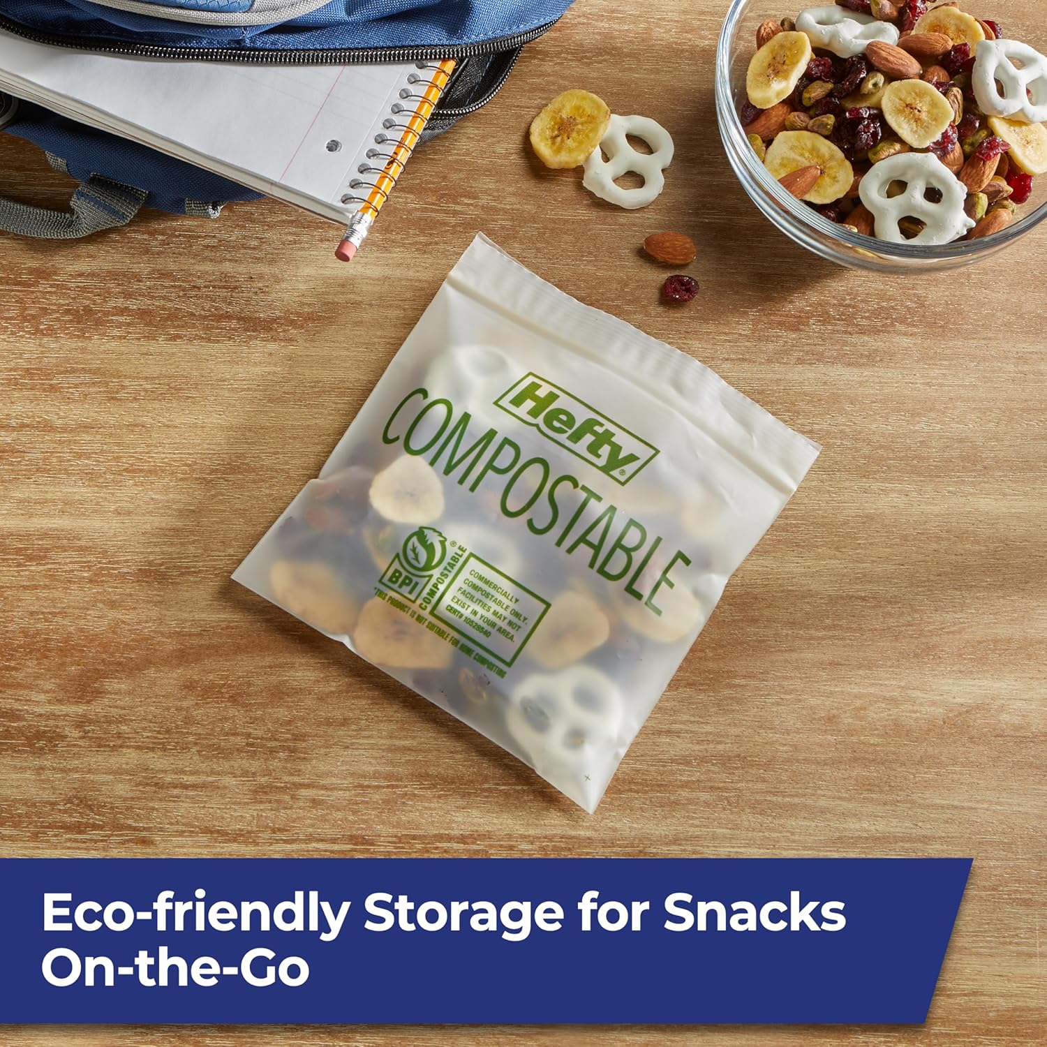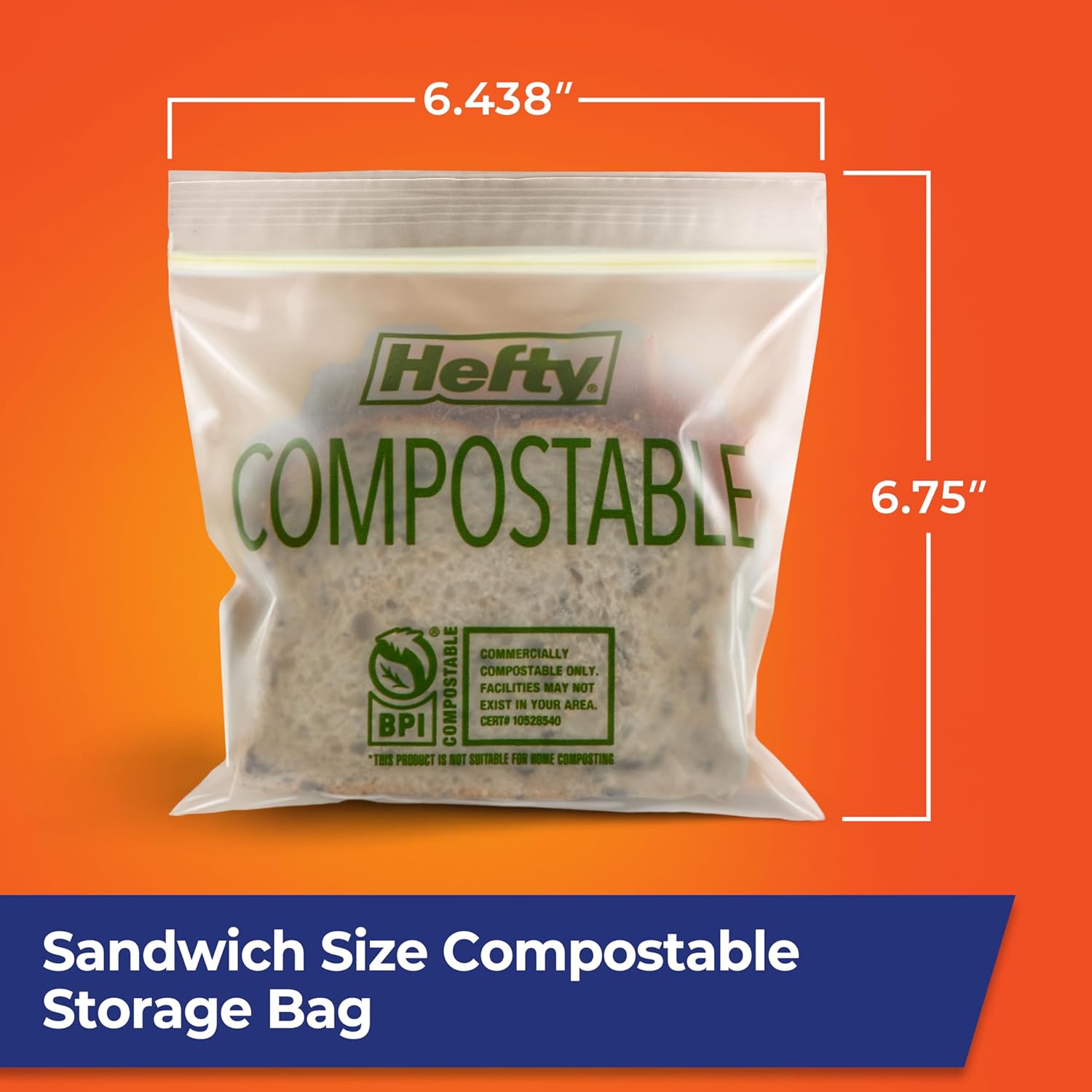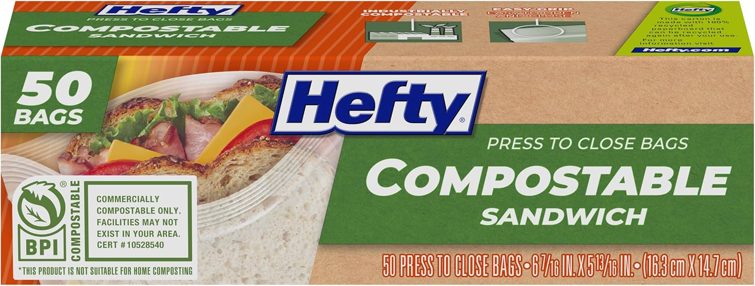 COMPOSTABLE SANDWICH BAGS—This pack includes 50 sandwich size Hefty Compostable Press to Close Food Storage Bags
