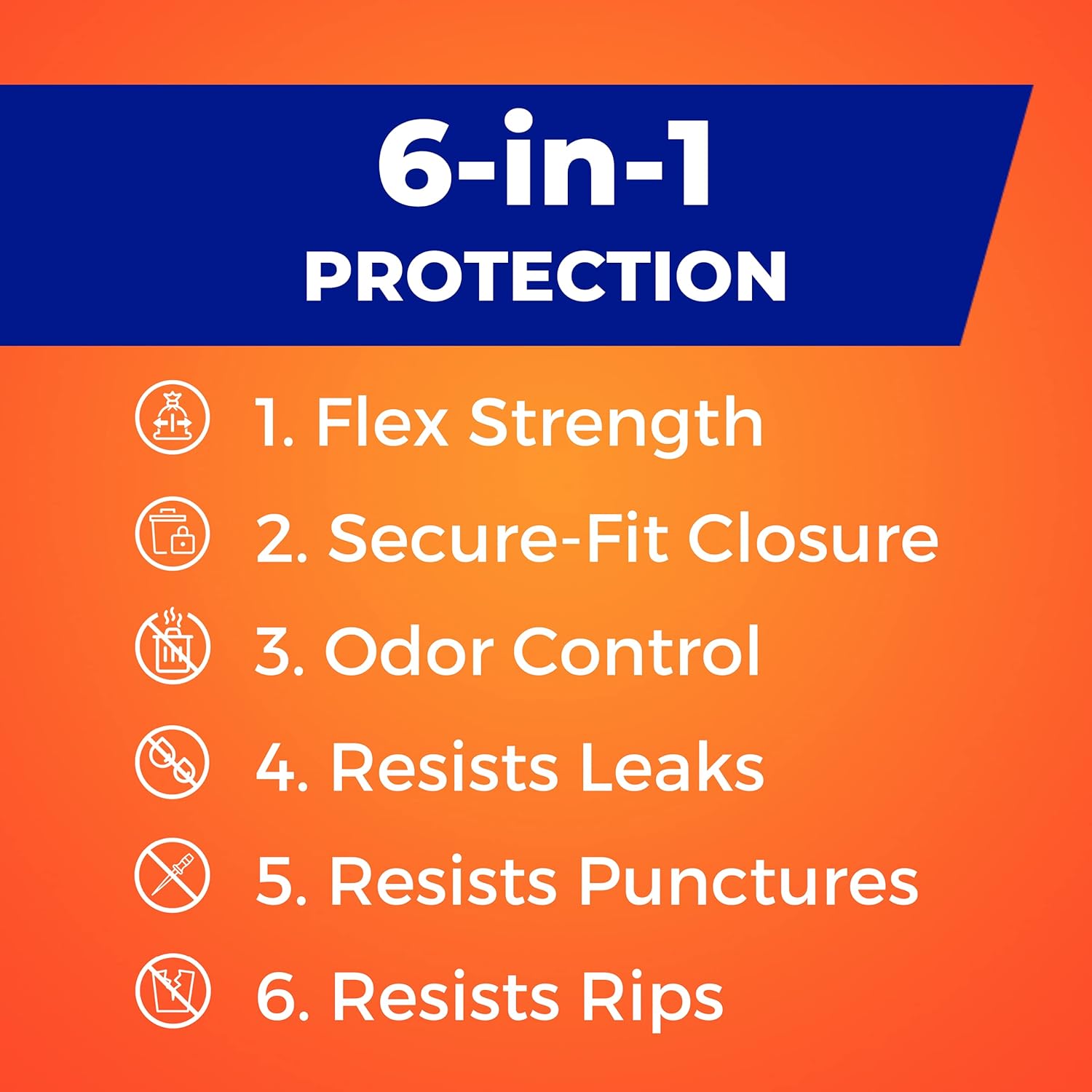 6-in-1 Protection-These Hefty 13 gallon trash bags offer a powerful combination of six features: flex strength, tough drawstring, patented odor control, and resistance to leaks, punctures, and rips