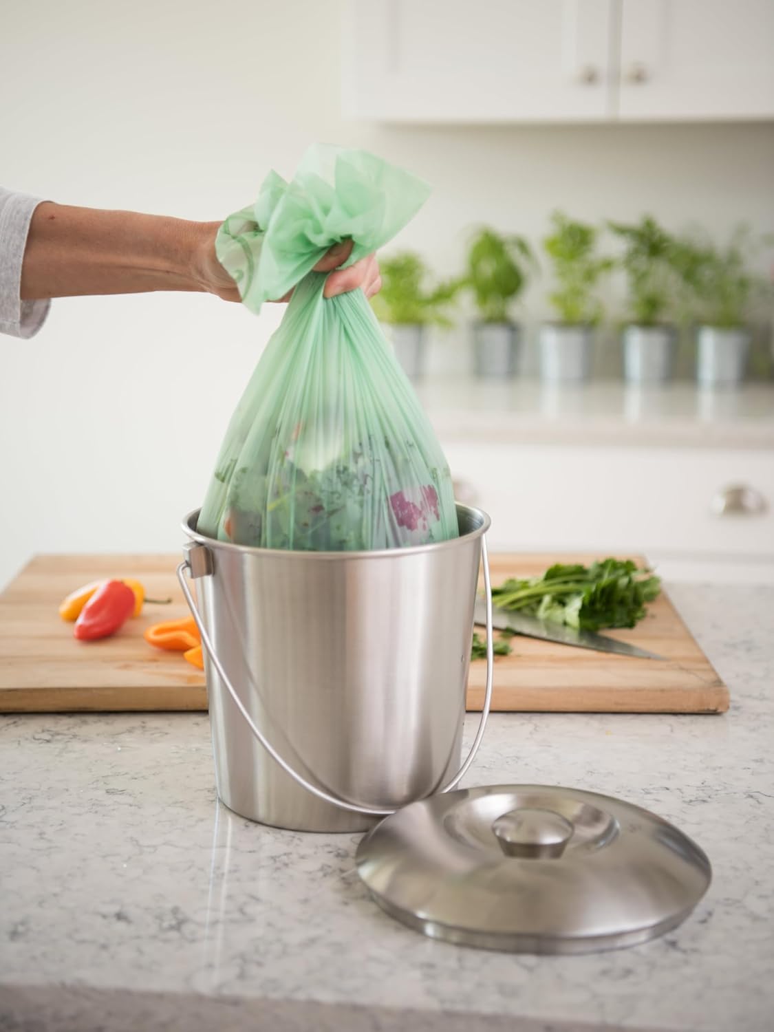 HIC Kitchen’s Natural Plant-Based Compost Bags biodegrade and compost into water and carbon dioxide for easy food scrap composting at home
