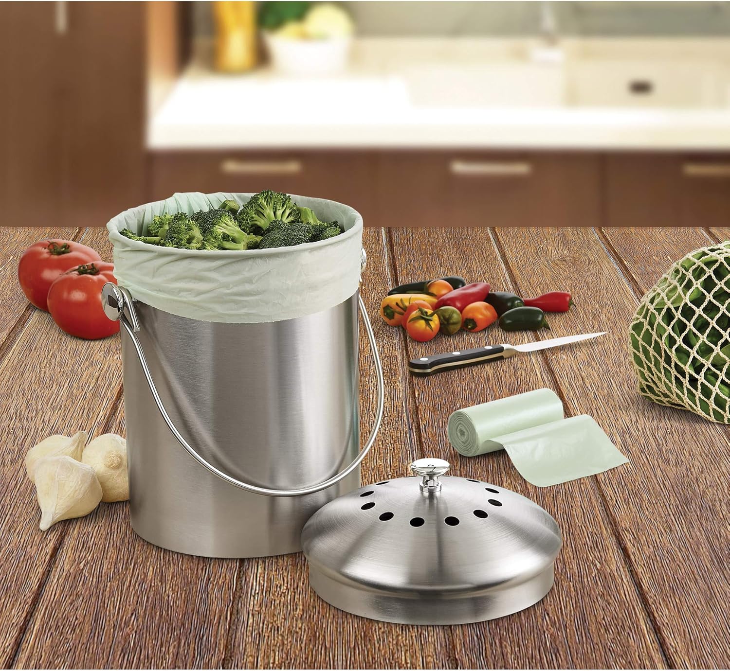 Perforated roll for easy bag separation; perfect choice for sustainable living practices; simply fill bags with scraps and discard in compost system