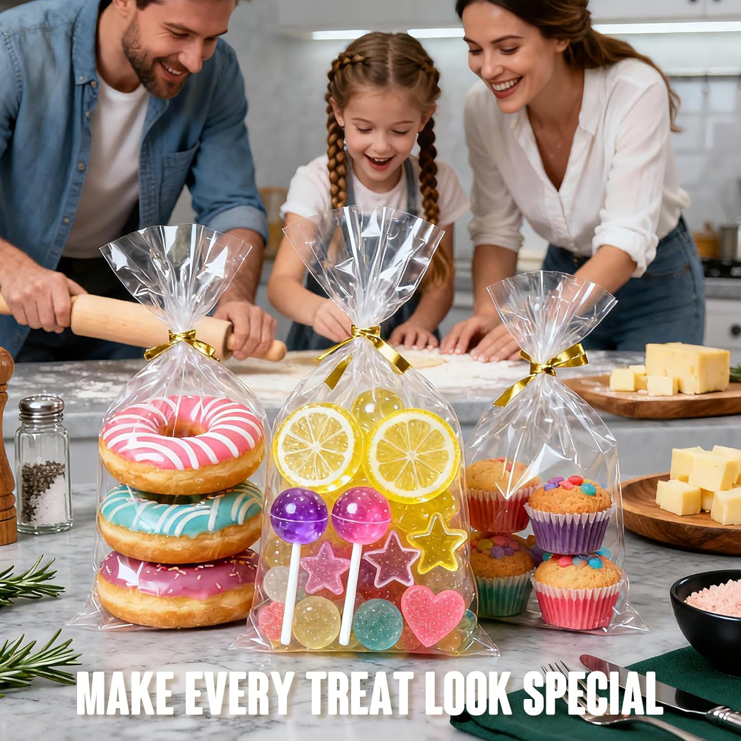 【Crystal Clear & Food-Grade Material】 Made of high-quality, food-safe OPP material, these cellophane treat bags are ultra clear and odor-free—perfect for showcasing cookies, candy, popcorn, and snacks beautifully.