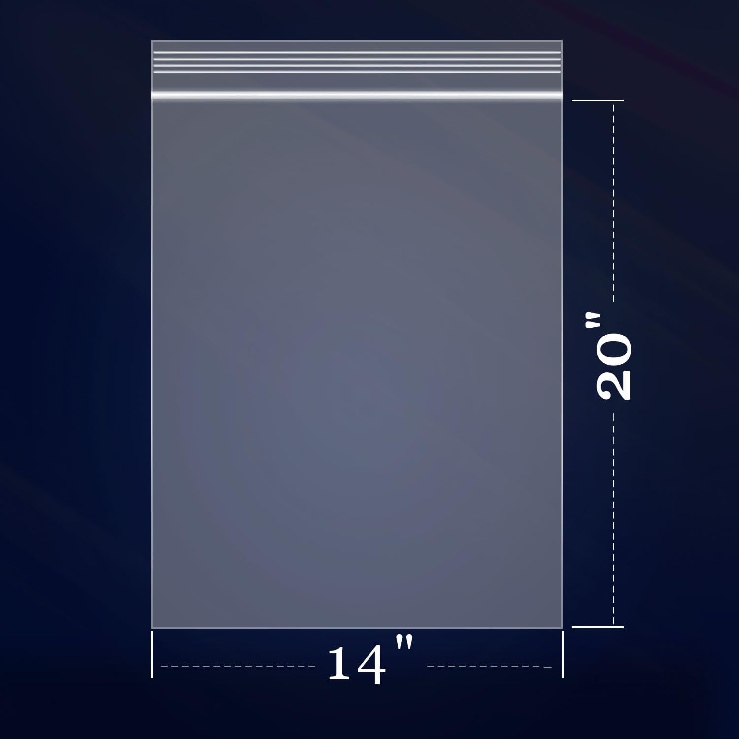1000 Count 14″ x 20″ Usable Dimension (excludes the zipper), 2.0 Mil Thickness Reclosable Zip Poly Bags.We have various sizes for you to choose from.