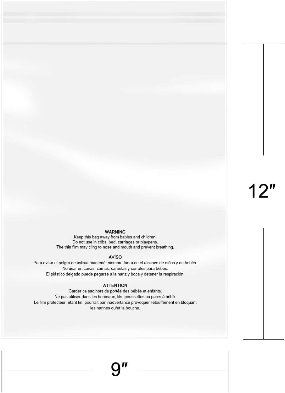 [Specifications]: 1000 Pcs – 9″ x 12″ Usable Dimension (Excludes Glue Flap). 1.6 Mil Thickness.Clear Poly Bags with Self-Seal Adhesive and printed Suffocation Warning.