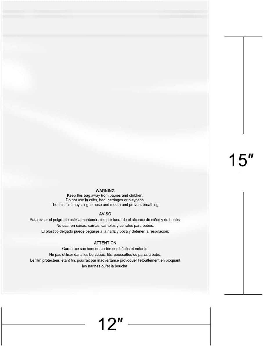 [Product Feature]- 100 Pcs – 12″ x 15″ Usable Dimension (Excludes Glue Flap). 1.6 Mil Thickness self-seal Clear Poly Bags Printed with Suffocation Warning.
