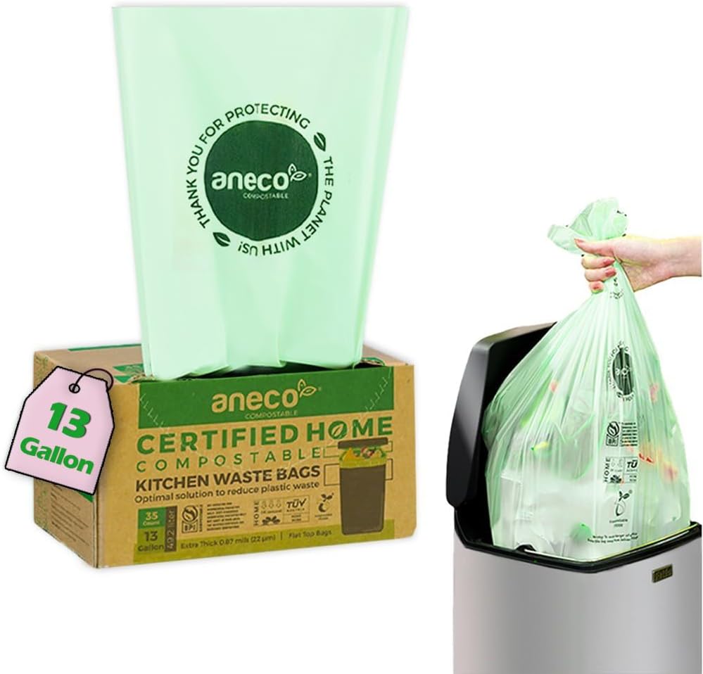 🍀 Proud to be one of few HOME compostable trash bags in the market, ANECO Compostable bag can break down completely not only in industrial facilities but also in home system. Use these bags to collect kitchen scraps and put them straight into the compost dumpster, or bury and turn them into valuable compost for your gardendecomposes fully into CO2, water and organic biomass after 6-12 months, leaving no traces of plastic in the environment.
