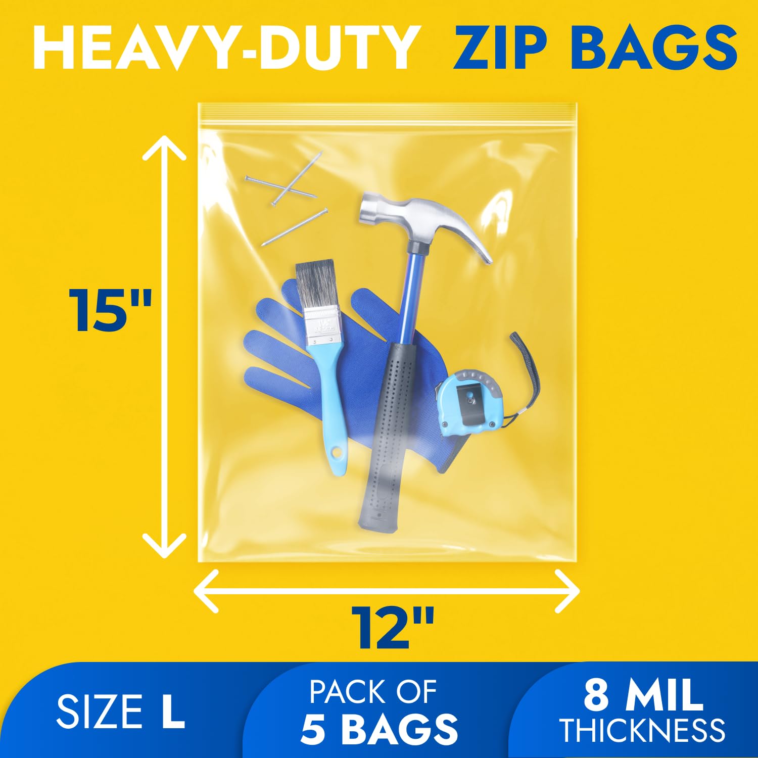 Large 12″ x 15″ Reclosable Poly Zip Seal Lock Bags, 8 Mil Thickness, Pack of 5 Clear Resealable Bags with Extra Durability, Waterproof Heavy-Duty