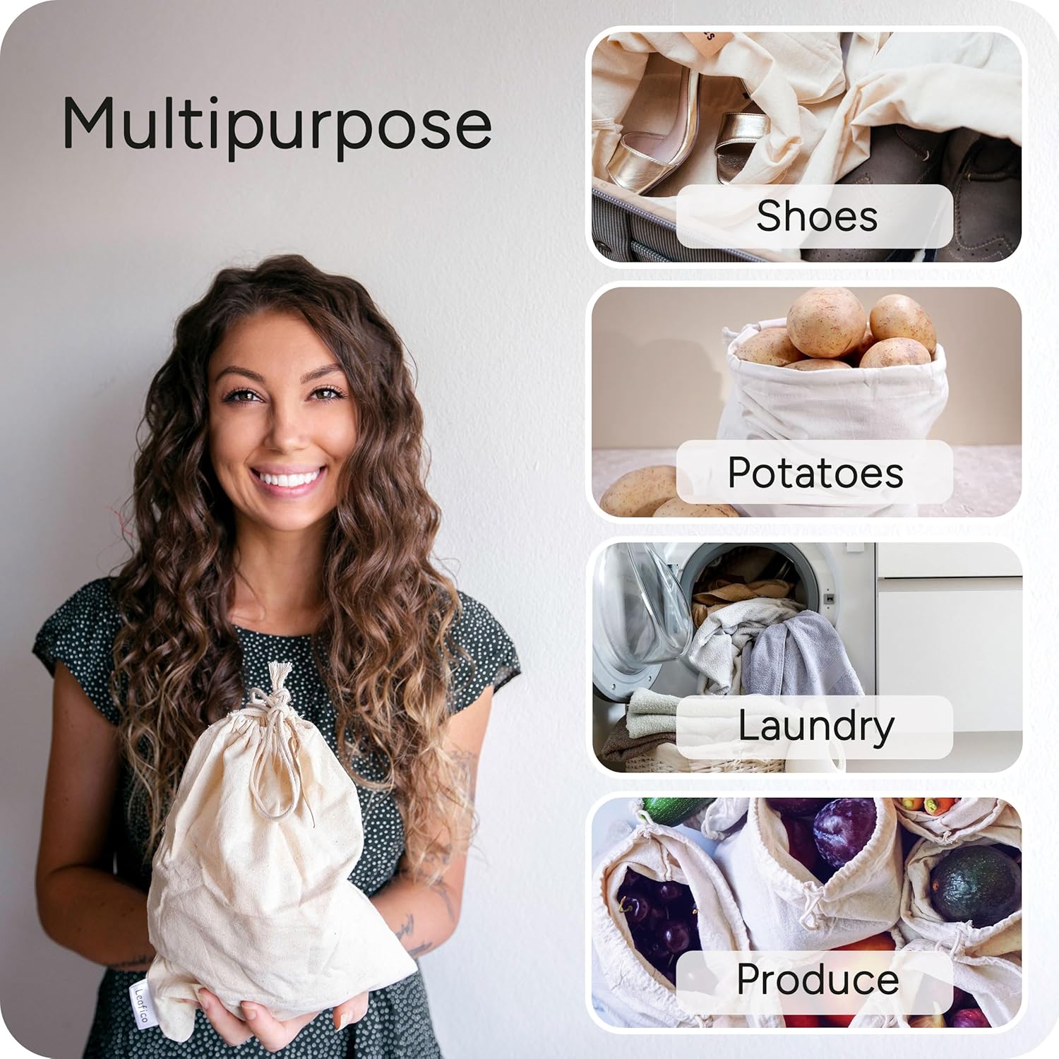 The video showcases the product in use.The video guides you through product setup.The video compares multiple products.The video shows the product being unpacked. Leafico Multipurpose Cotton Bags Merchant Video