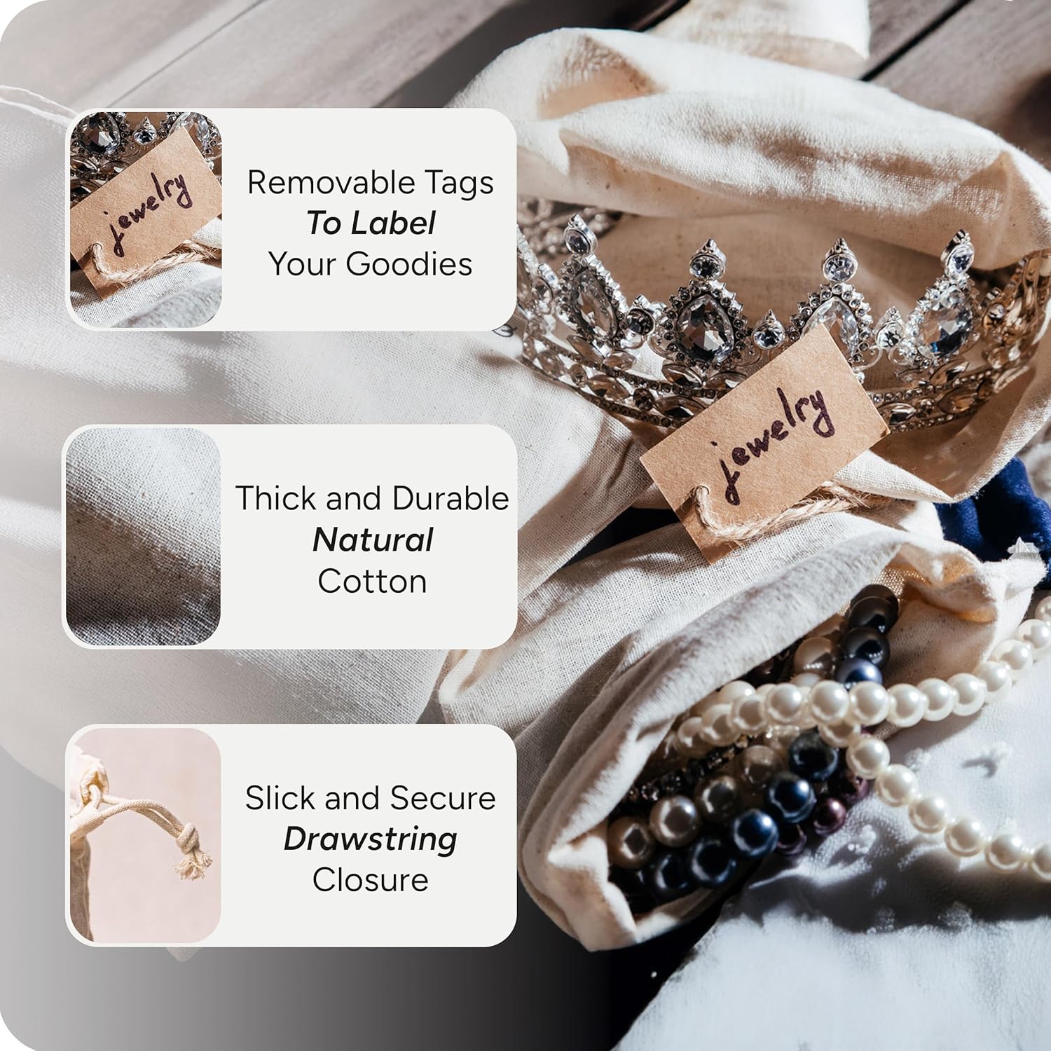 Multipurpose Cotton Storage Bags – Reusable drawstring bags designed for everyday organization. Suitable for storing household items such as toys, accessories, jewelry, craft supplies, travel essentials, party favors, and gift packaging
