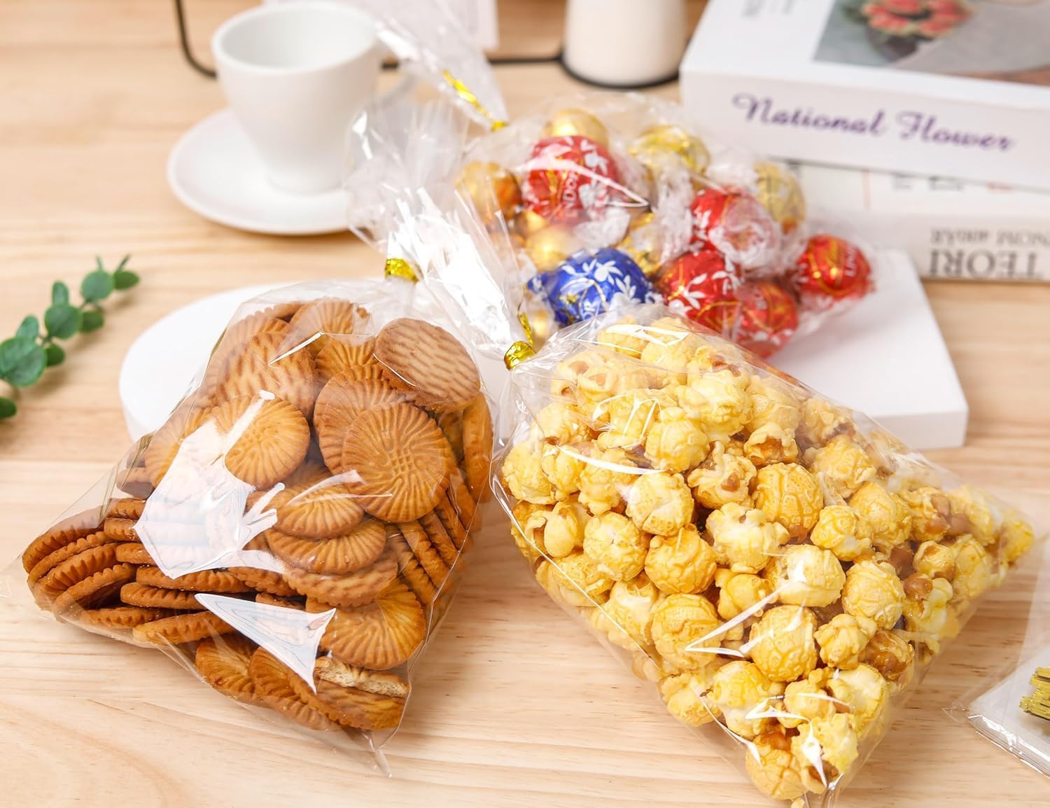 Package: 100 pack clear treat bags with 100 twist ties,nice bags for homemade cookies, candy, snacks, nut, lollipops, biscuits, berries, gift or anything you want to pack