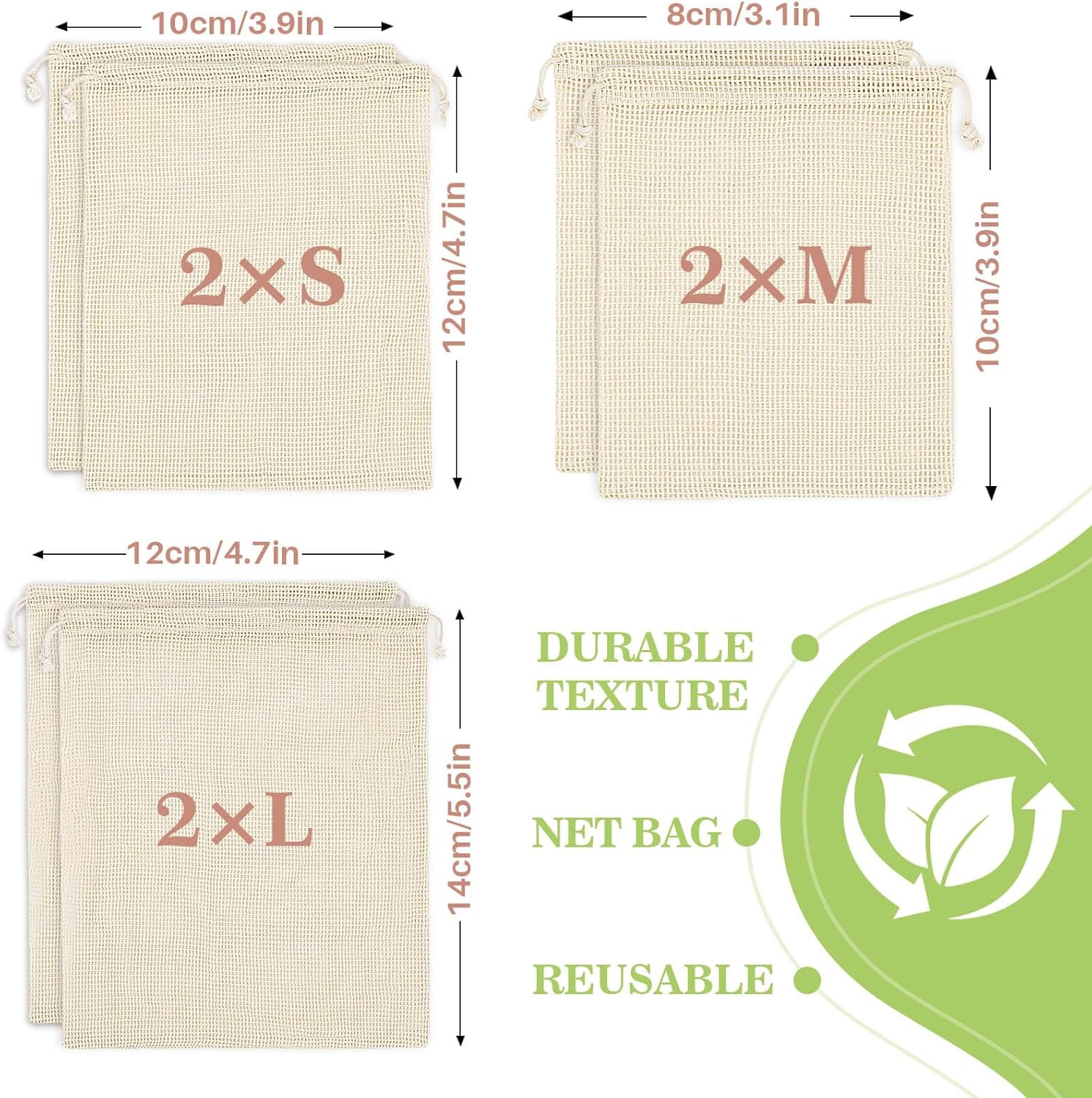 MAQIHAN 6 Pack Reusable Produce Bags Cotton Mesh Produce Bags Mesh Storage Produce Bags Reusable Durable Double Stitched With Drawstring Produce Bag For Vegetables,Fruit & Grocery Shopping (2L,2M,2S)