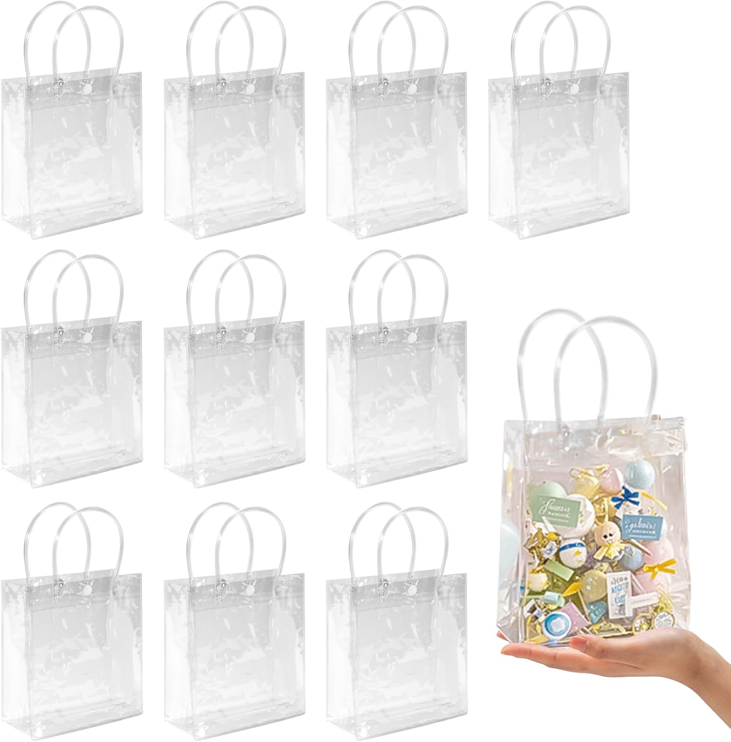 WHAT YOU GET: You will receive a pack of 10 gift wrap bags of the same style, size 5.9 x 6.3 x 2.7 inch(mini tote bag). This style of clear gift bags for favors is suitable for parties, holiday gift-giving, school events, prize presentations, and more. Please ensure this size of clear gift bag meets your needs before purchasing. We wish you a wonderful shopping experience