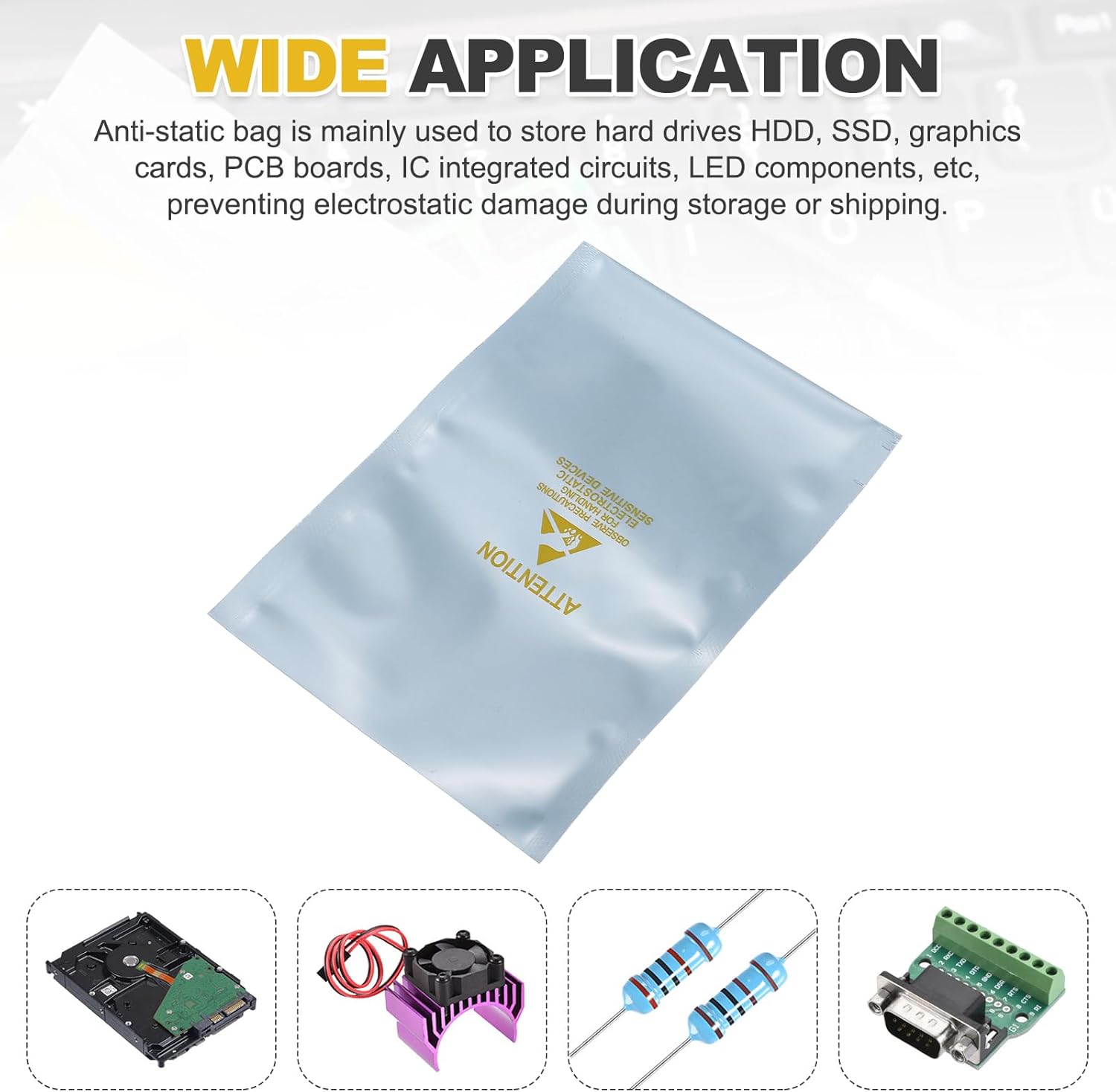 Anti-static bag is a useful tool for storing various electronic devices. Mainly used to store hard drives HDD, SSD, graphics cards, PCB boards, IC integrated circuits, LED components, data cables, electronic devices, motherboards, and other computer accessories etc. These silver Shielding Bags prevent electrostatic damage during storage or shipping.