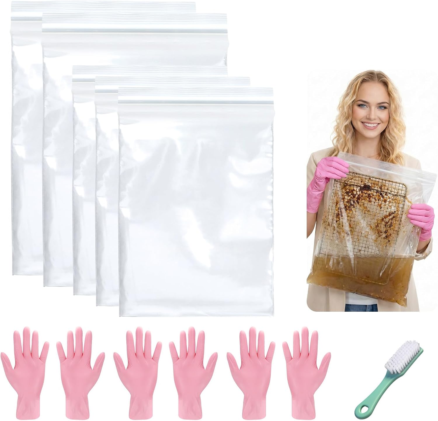 Mity Rain 5 Packs Oven Rack Cleaning Bag Kit, Reusable No-Scrub Oven Rack Cleaning Bags, Includes three gloves and one brush (three 23.62*35.43 inch and two 31.50*39.37inch) leak-resistant PE bags
