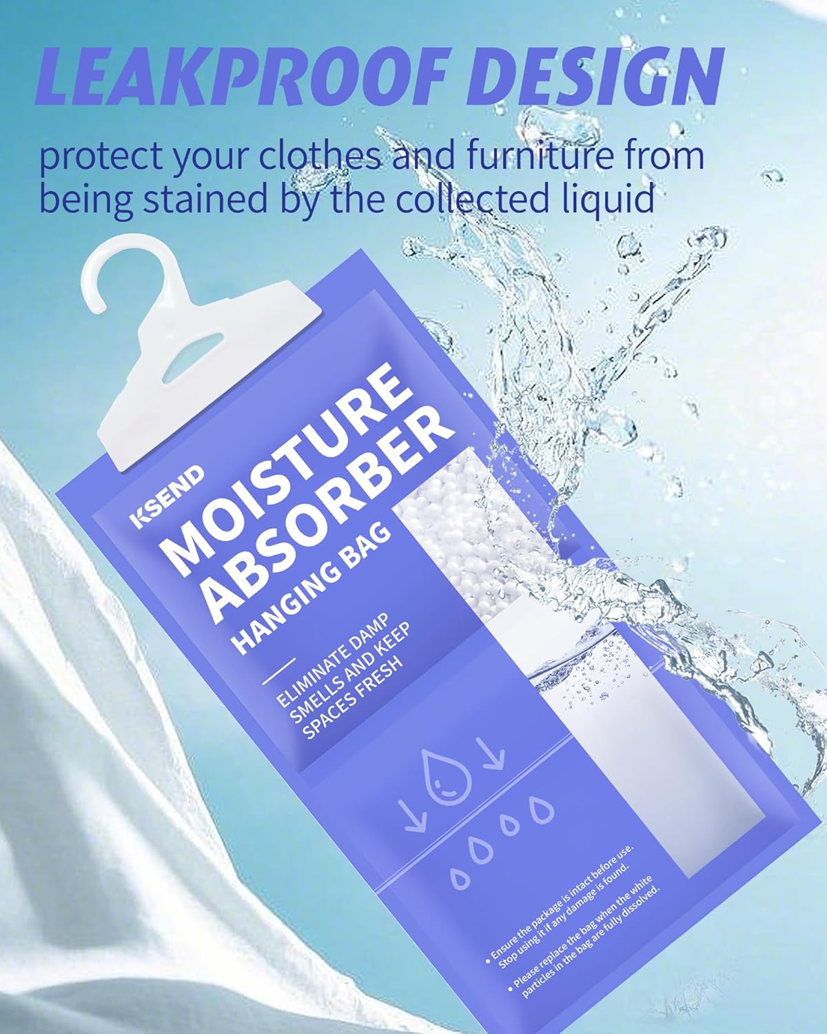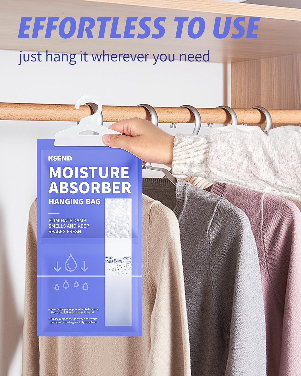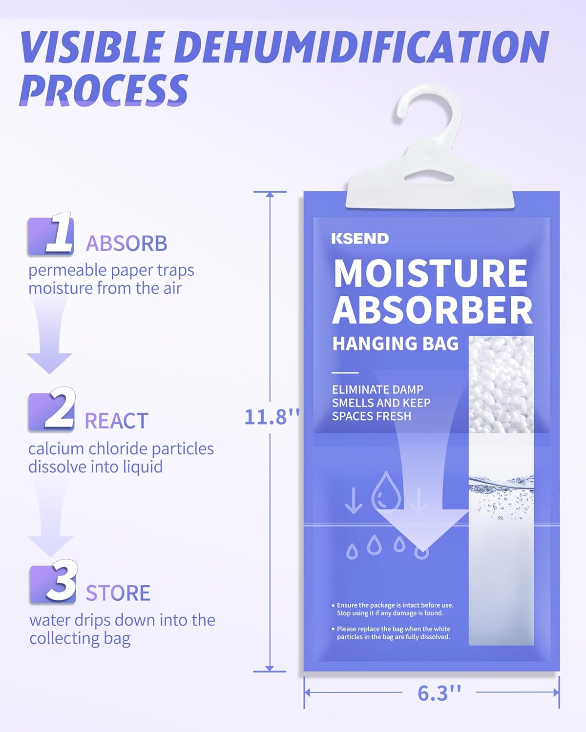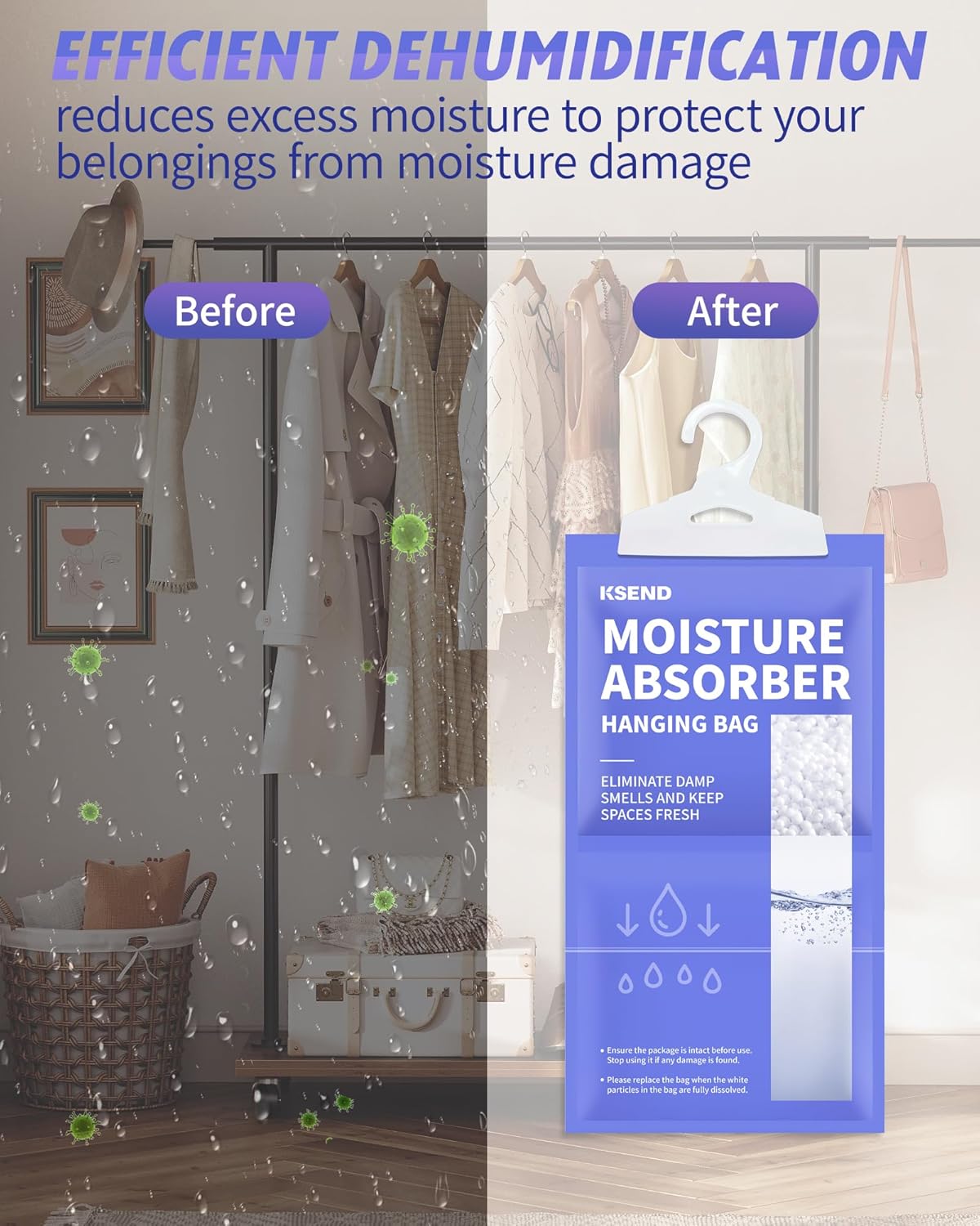 IDEAL FOR VARIOUS ROOMS: Ksend dehumidifier pack comes in compact packaging, making it easy to carry and store wherever needed. It suits various spaces, including closets, laundry rooms, bathrooms, and kitchens. To effectively control humidity, you can adjust the number of dehumidifier bags used based on the size and humidity of each room.