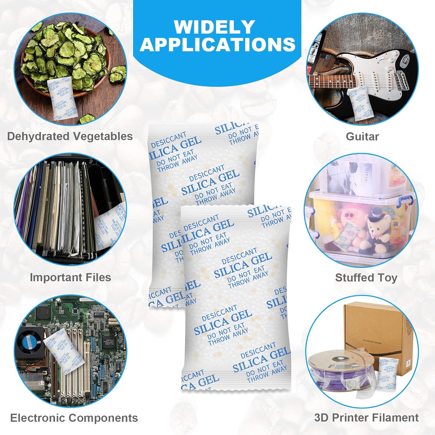 【WIDELY APPLICATIONS】– Our silica gel packets are widely used in your daily life, such as Foods, Vitamins, Seeds, Nuts, Snacks, Cookies, Spices, Pet Foods, 3D Filaments, Safes, Ammos, Canister, Jewelry, Documents, Camera Lens, Clothes, Cosmetics, Books, Bags, Decorations, Cameras, Watches, Electronics, Shoes, and many other valuables.